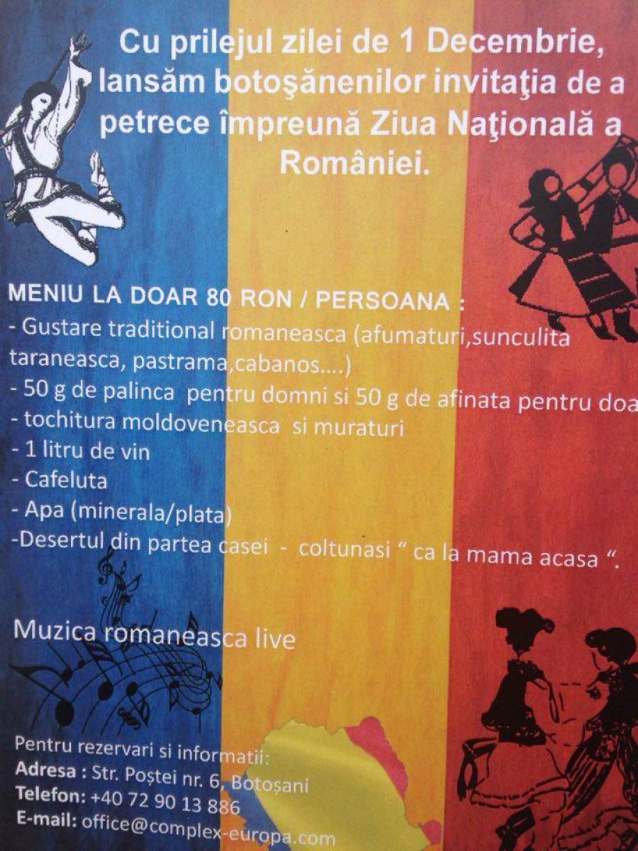 Complex Europa este locul în care, cetățenii urbei care doresc să se destindă după manifestările din Piața 1 Decembrie, cu un meniu special și muzică românească live. Prețul pentru o singură persoană este de 80 de lei iar în schimb invitații primesc gustări tradiționale, palincă, afinată sau vin, tochitură moldovenească sau desert din partea casei. Botoșănenii care nu își permit să petreacă la restaurnt de Ziua Națională a României, se vor mulțumi cu porțiile de fasole și cârnați acordate de Primăria Botoșani. (G.E.)