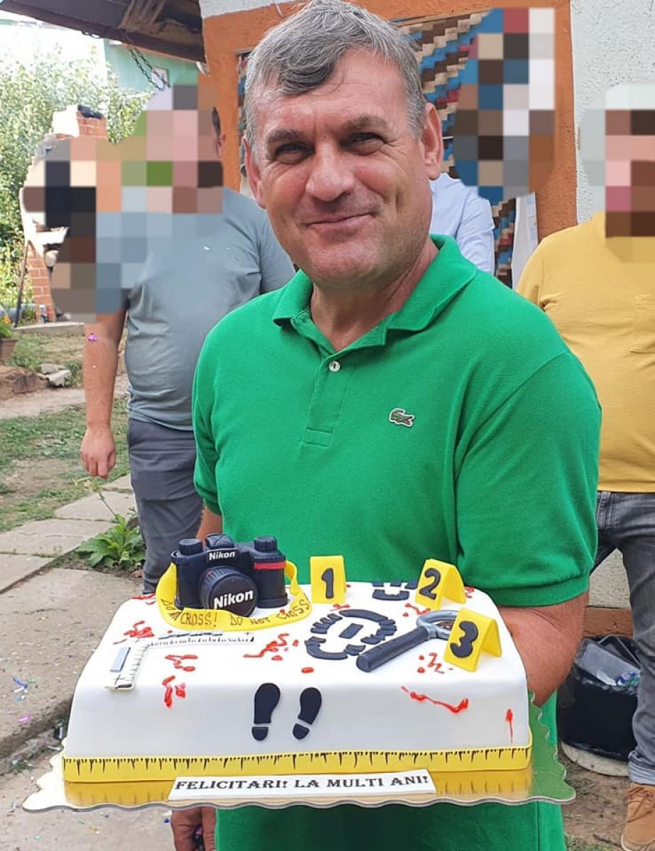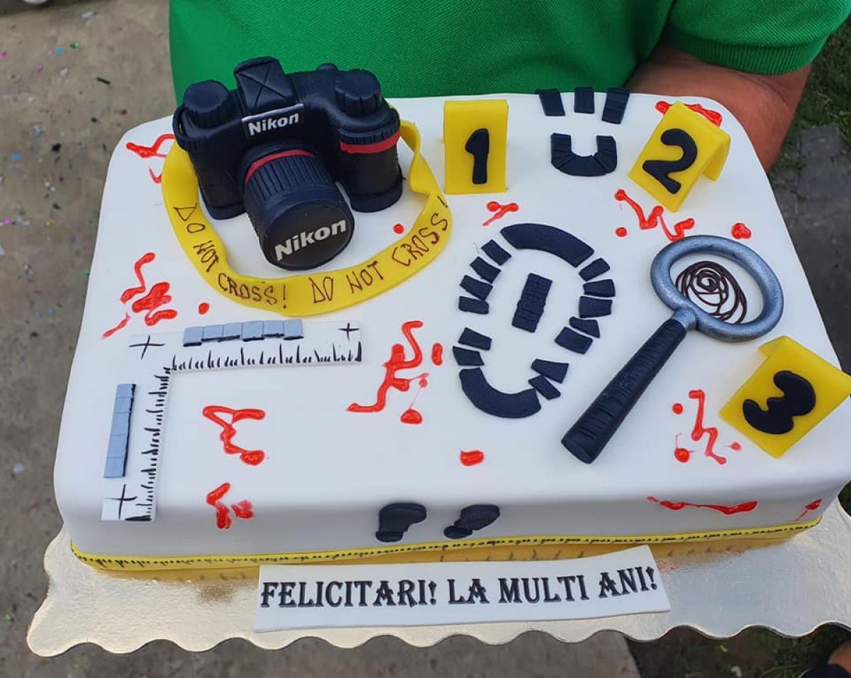 Un polițist din cadrul Serviciului Criminalistic a ieșit la pensie, iar colegii i-au pregătit un tort care să îi amintească de cei 27 de ani de carieră.