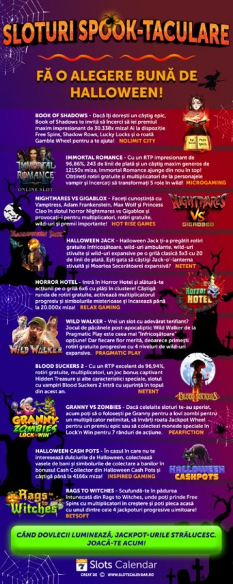 Au mai rămas doar câteva zile până la Halloween, așa că a venit momentul să dai decorațiunile jos din pod și să începi pregătirile pentru ziua cea mare! Poți să sculptezi un dovleac, să faci un maraton de filme de groază și, bineînțeles, să joci niște super sloturi de Halloween! Ca de fiecare dată, vrem să te ajutăm să ai cea mai tare experiență la cazinou, așa că ți-am pregătit un info grafic cu cele mai populare 10 sloturi de Halloween! Aruncă-le și tu o privire și pregătește-te pentru câștiguri de speriat!