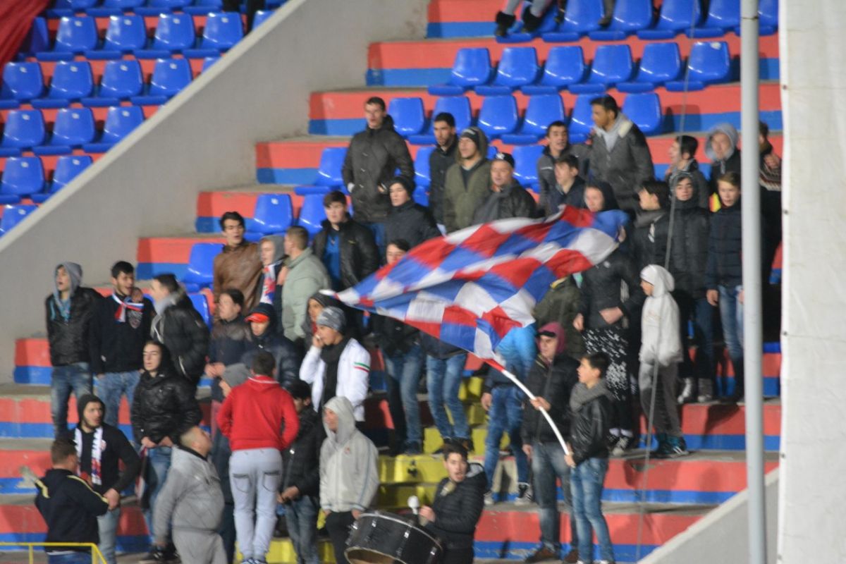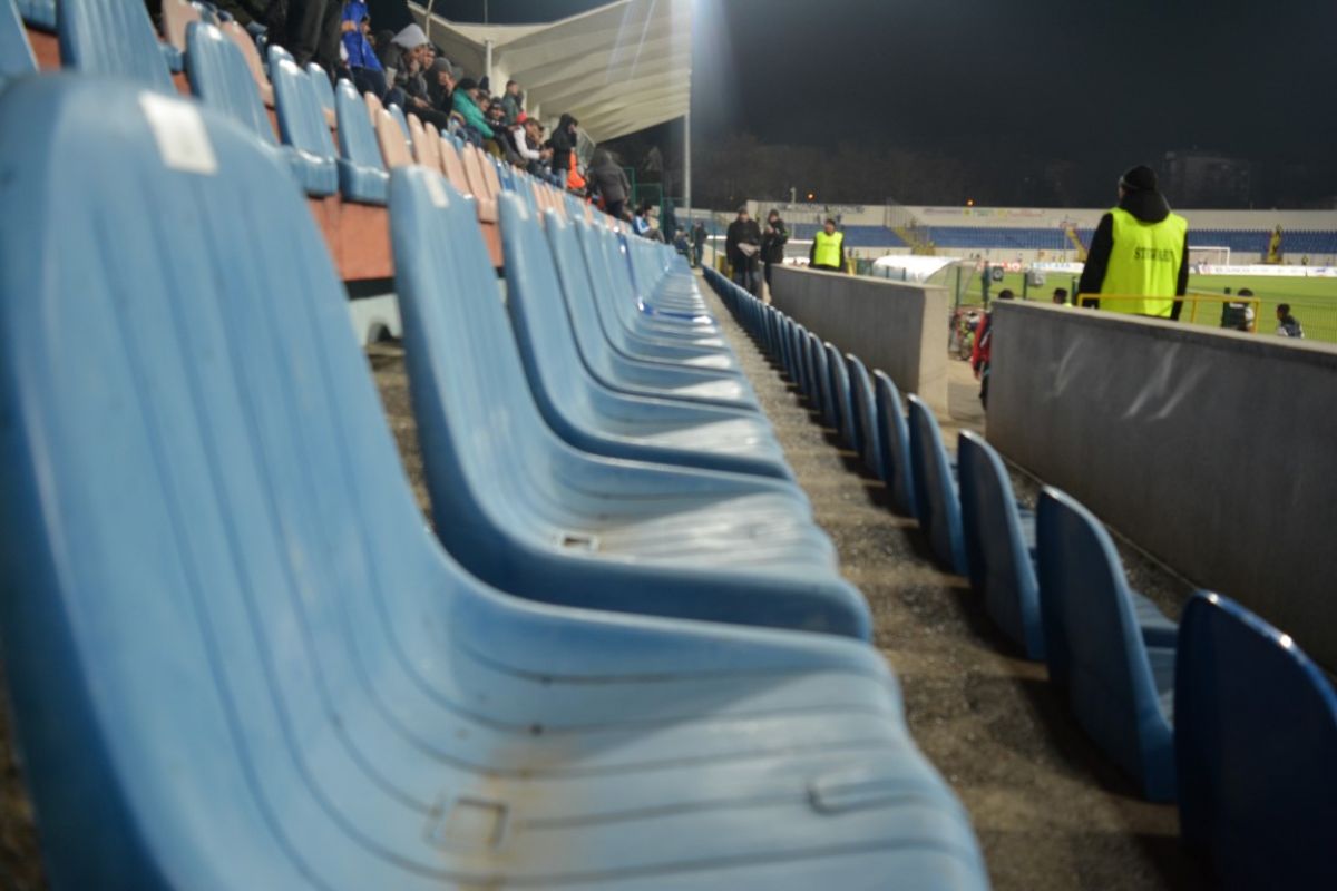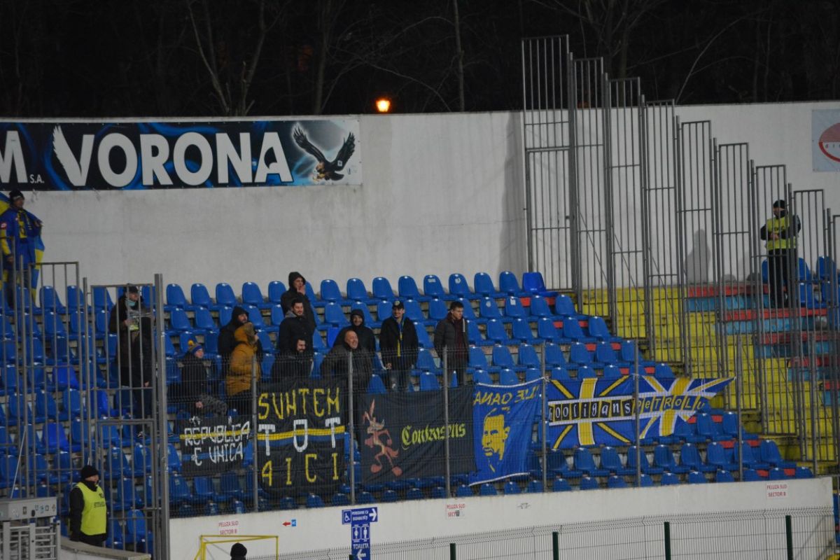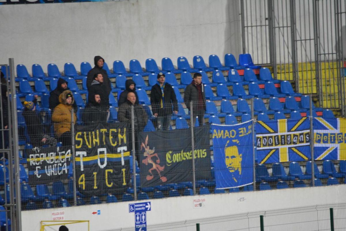 Sub 2.000 de spectatori se află la această oră pe Stadionul Municipal la meciul pe care echipa fanion a judeţului îl dispută cu Petrolul Ploieşti. La peluza Marian Crudu se află exact 29 de suporteri ai roş-alb-albaştrilor, la care se adaugă 11 ai „găzarilor”. La peluza Ion Bordeanu, acoperită trei sferturi de un tricolor uriaş, sunt doar vreo sută de spectatori, iar tribunele au ocupate aproximativ jumătate din scaune. Iar toate acestea se întâmplă în condiţiile în care clubul a ieftinit cu 50% preţurile la bilete faţă de meciul precedent, intrarea fiind astăzi de 10 lei. (S.B.)