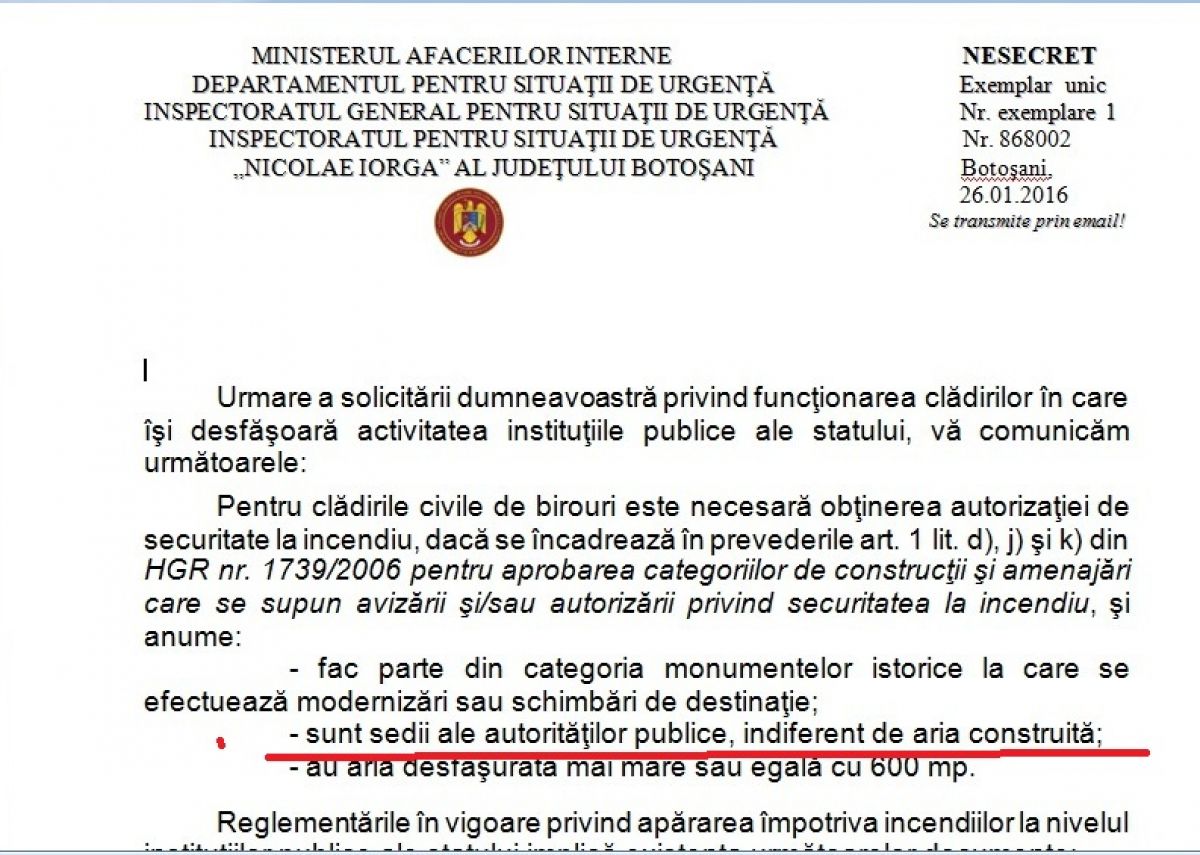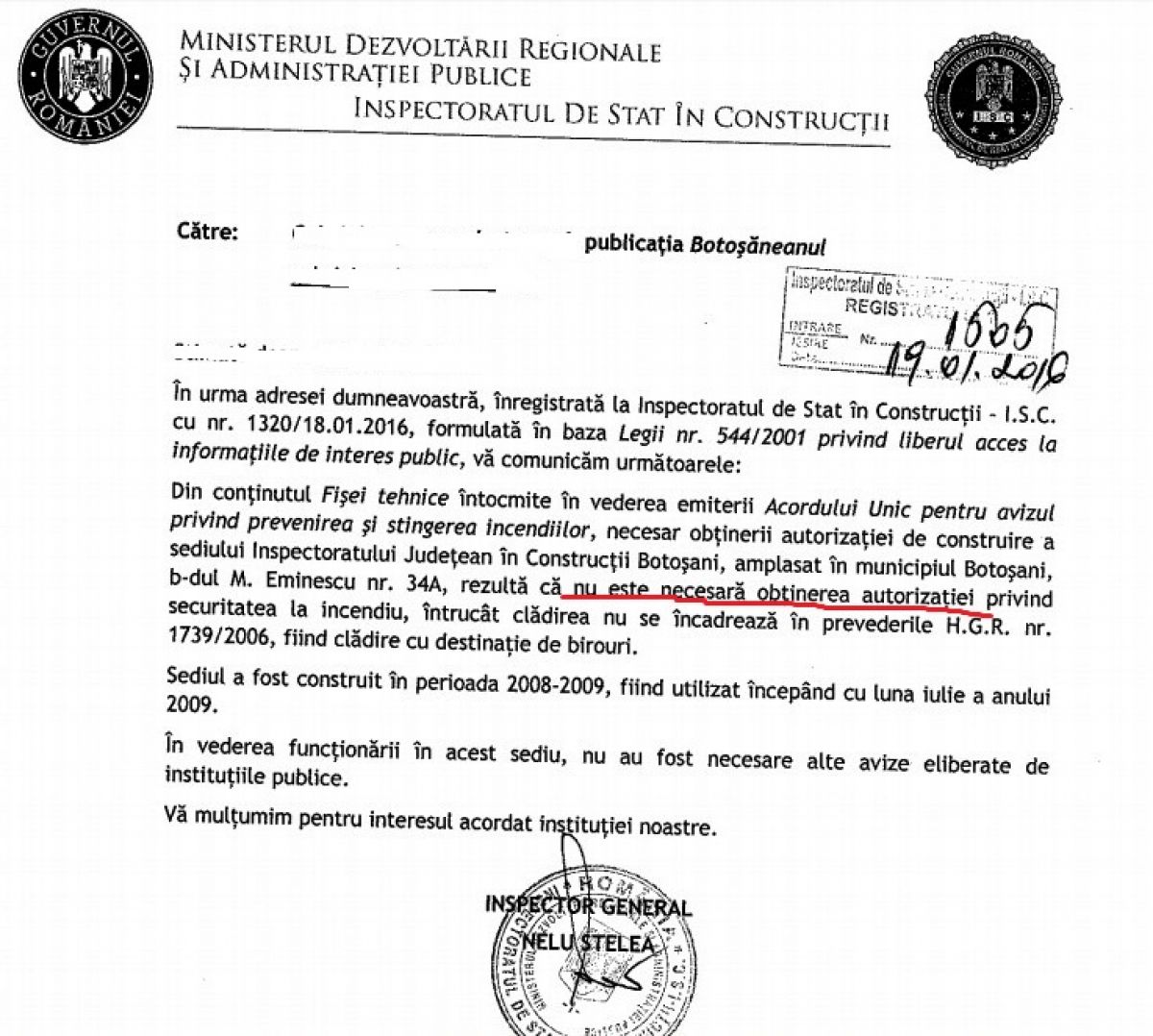 ”Din conținutul fișei tehnice întocmită în vederea emiterii Acordului Unic pentru avizul privind prevenirea și stingerea incendiilor, necesar obținerii autorizației de construire a sediului Inspectoratului Județean în Construcții Botoșani , amplasat în municipiul Botoșani, Bulevardul Mihai Eminescu, rezultă că nu este necesară obținerea autorizației privind securitatea la incendiu, întrucât clădirea nu se încadrează în prevederile HG nr.1739/2006, fiind clădire cu destinație de birouri” – se arată în adresa semnată de Nelu Stelea, inspectorul general al Inspectoratului de Stat în Construcții de la București.