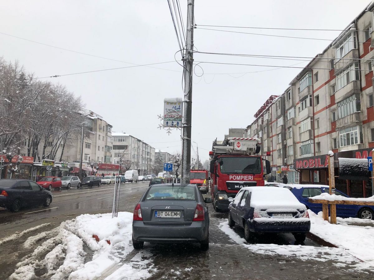 Două mașini de pompieri au sosit la fața locului și pentru a înlătura zăpada de pe acoperișul blocului, care de asemenea, putea cauza probleme pietonilor aflați în preajmă.