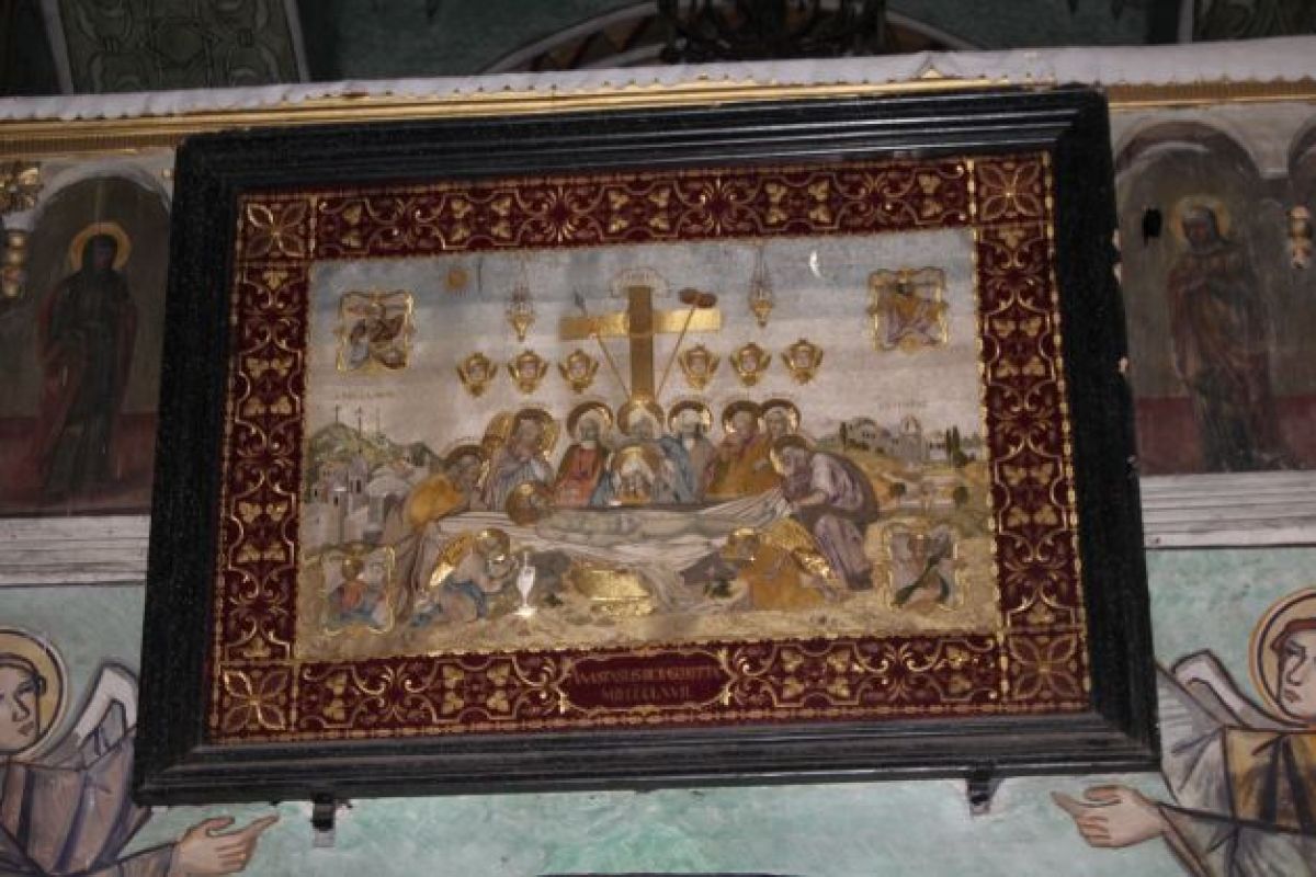 În primul rând este vorba despre un epitaf, o tapiserie brodată în fir de aur, amplasat pe unul dintre pereţii bisericii, reprezentând aşezarea lui Iisus Hristos în mormânt. Pe lângă lucrătura deosebită şi valoarea epitafului, despre această broderie se spune că ar avea puteri aparte. Mai precis îşi schimbă culorile în funcţie de anotimpuri şi condiţiile meteorologice.
