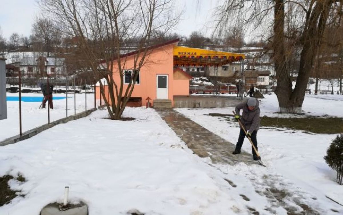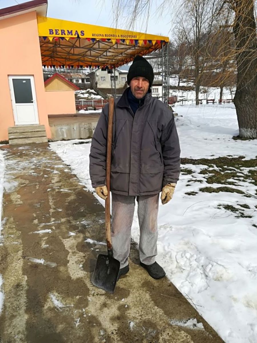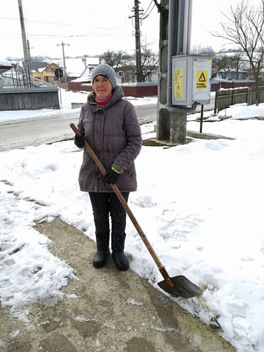 Alături de el, la deszăpezirea uliţelor lucrează şi Viorica. Deşi are peste 50 de ani, mânuieşte bine lopata şi munceşte cot la cot cu bărbaţii.