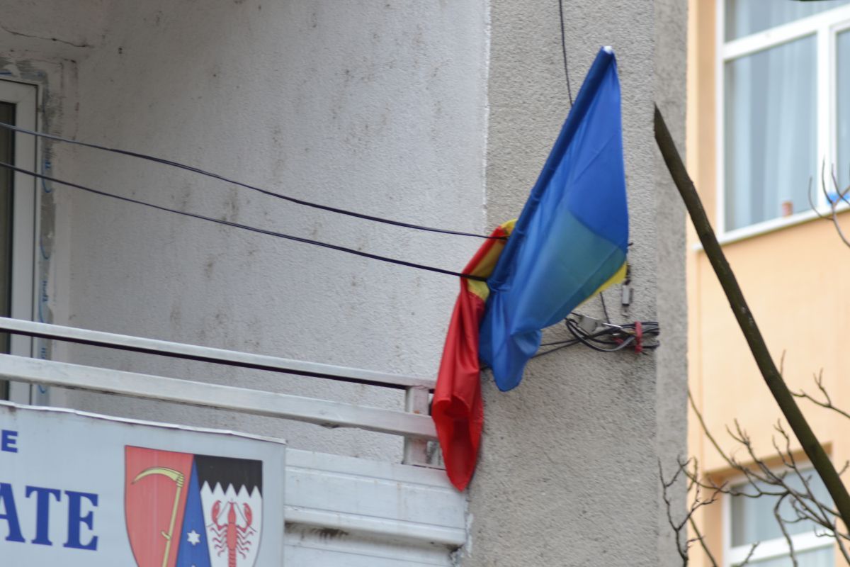 ”Și prin oraș, la intersecția Octav Onicescu cu Calea Națională sunt aceleași drapele ferfeniță”