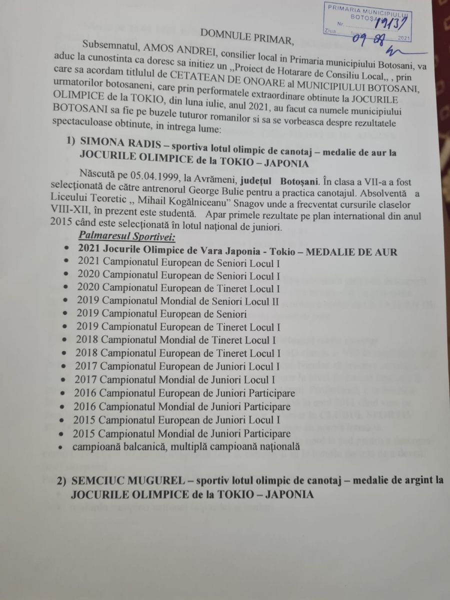 „Mi-am exprimat dorința de a iniția un proiect de hotărâre pentru a acorda titlul de cetățean de onoare sportivilor medaliați la Jocurile Olimpice de la Tokyo cât și antrenorilor lor. Acum 30 de minute am depus fundamentarea la Registratură, prin care solicit inițierea acestui proiect de hotărâre. Menționez că sunt singurul care am discutat cu sportivii, atât cu Simona cât și cu Mugurel, sunt singurul oficial al Primăriei care i-am felicitat și am cerut acordul pentru a iniția acest proiect de hotărâre. Au fost încântați și onorați”,