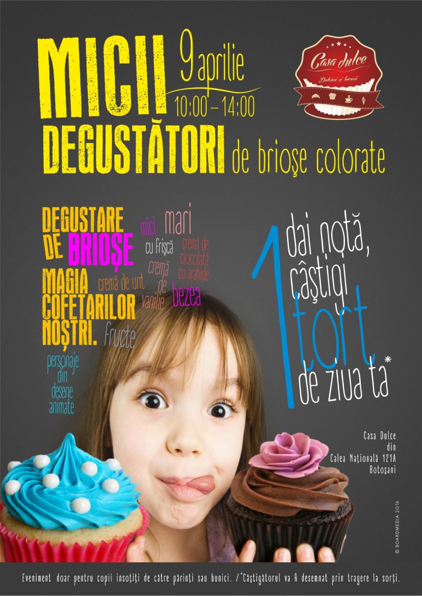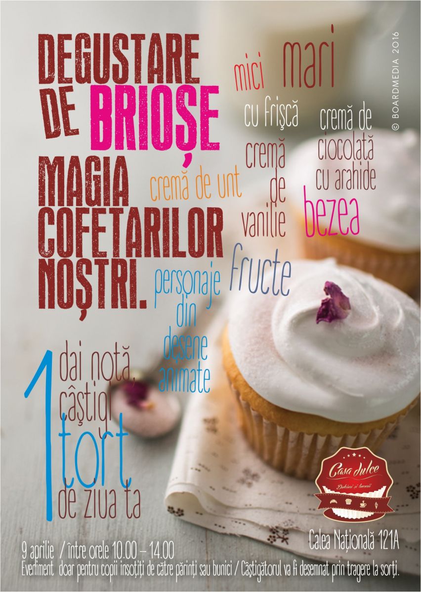 Briose mari, briose mici, cu frisca, crema de unt, crema de ciocolata cu arahide, bezea, crema de vanilie, fructe. Briose cu personaje din desene animate, emoticoane, minions, mickey mouse, etc., toate create de cofetarii nostri! Si asta nu e tot! Vii, degusti, iti treci numele copilului pe un formular, dai o nota briosei preferate si ..printr-o tragere la sorti castigi tortul copilului de ziua lui !!! Eveniment doar pentru copii insotiti de catre parinti sau bunici!