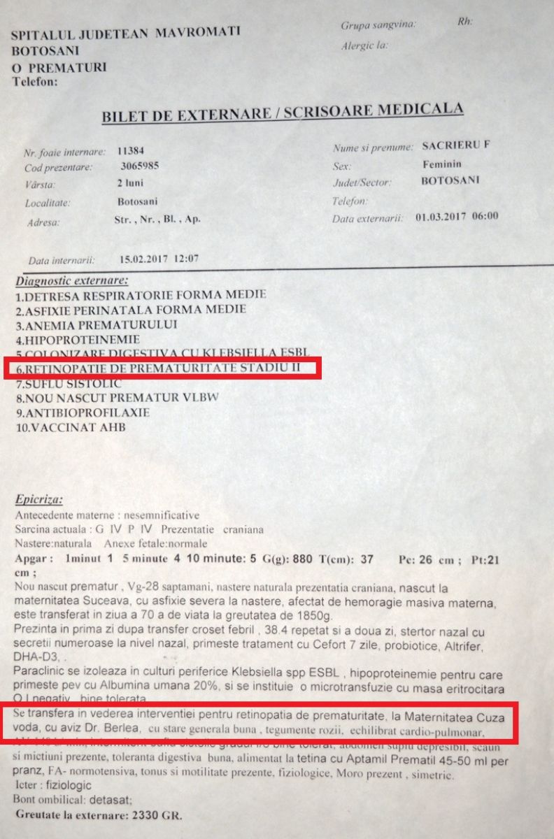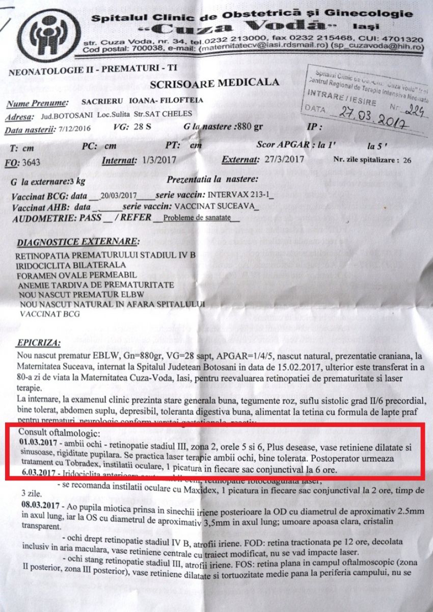 Aşa scrie în biletul de externare de la Maternitatea Botoşani, unde a stat alte două săptămâni. Aici i-a fost descoperită afecţiunea oculară. „Retinopatie de prematuritate” a fost diagnosticul medicilor, care au hotărât să o transfere la Spitalul Clinic de Obstetrică şi Ginecologie „Cuza Vodă” Iaşi pentru o intervenţie chirurgicală.