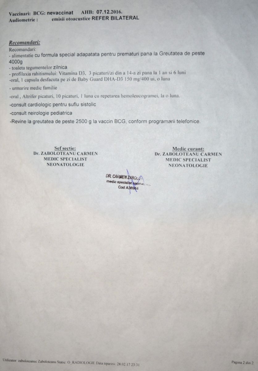 „Nou născut prematur cu asfixie severă la naştere, afectat de hemoragie masivă maternă, este transferat în ziua a 70 – a de viaţă la greutatea de 1.850 grame”.