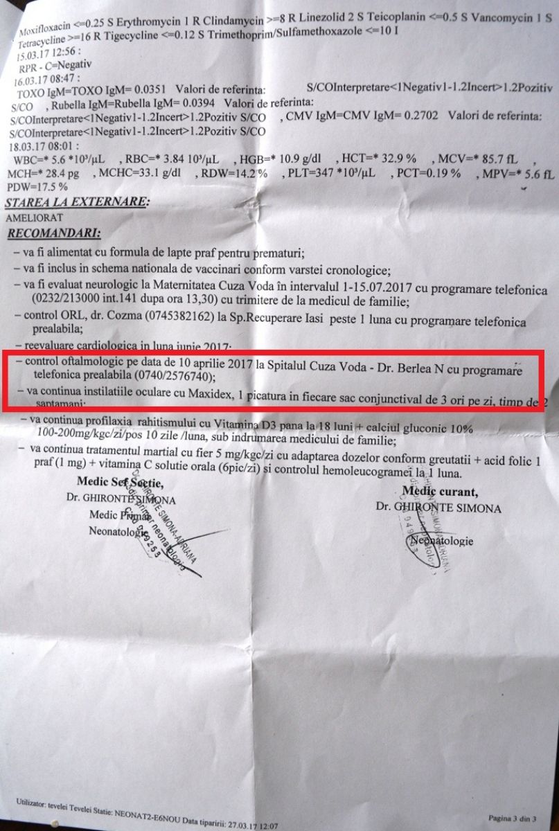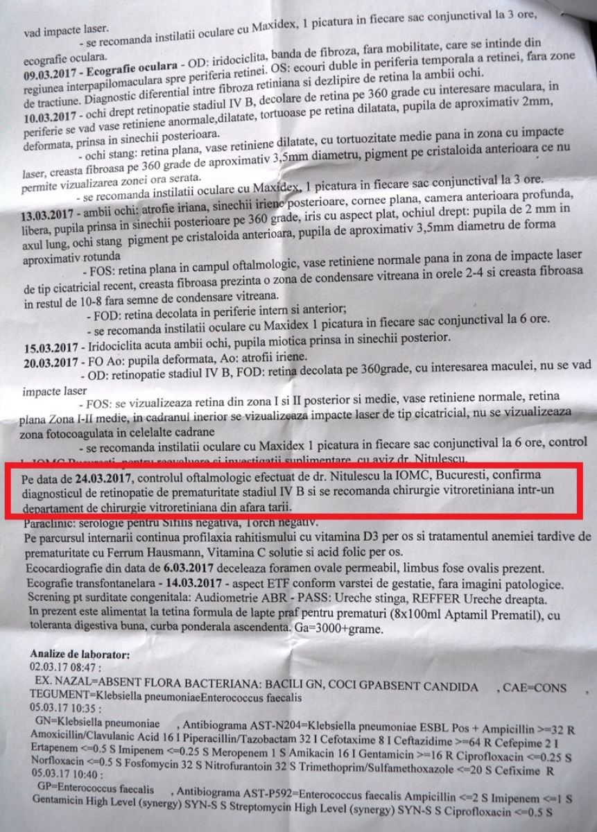A stat trei săptămâni şi la maternitatea din Copou, unde, după cum se menţionează în scrisoarea medicală, „se practică laser terapie ambii ochi”. Medicii ieşeni nu au reuşit să îi ofere puţină lumină.
