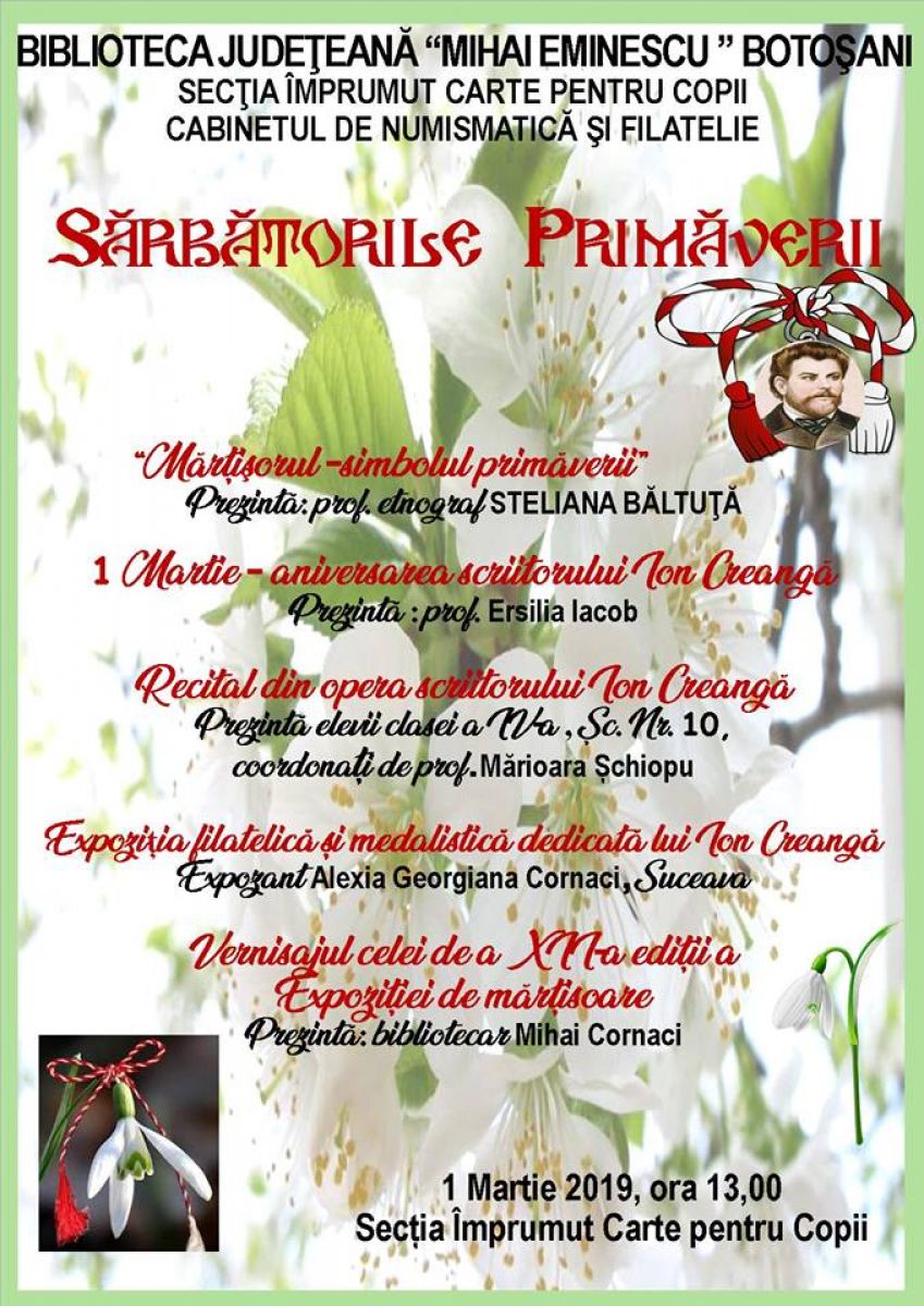 Biblioteca Județeană ”Mihai Eminescu” Botoșani organizează, în data de 1 martie 2019, începând cu ora 13:00, activitatea ”Sărbătorile Primăverii”.