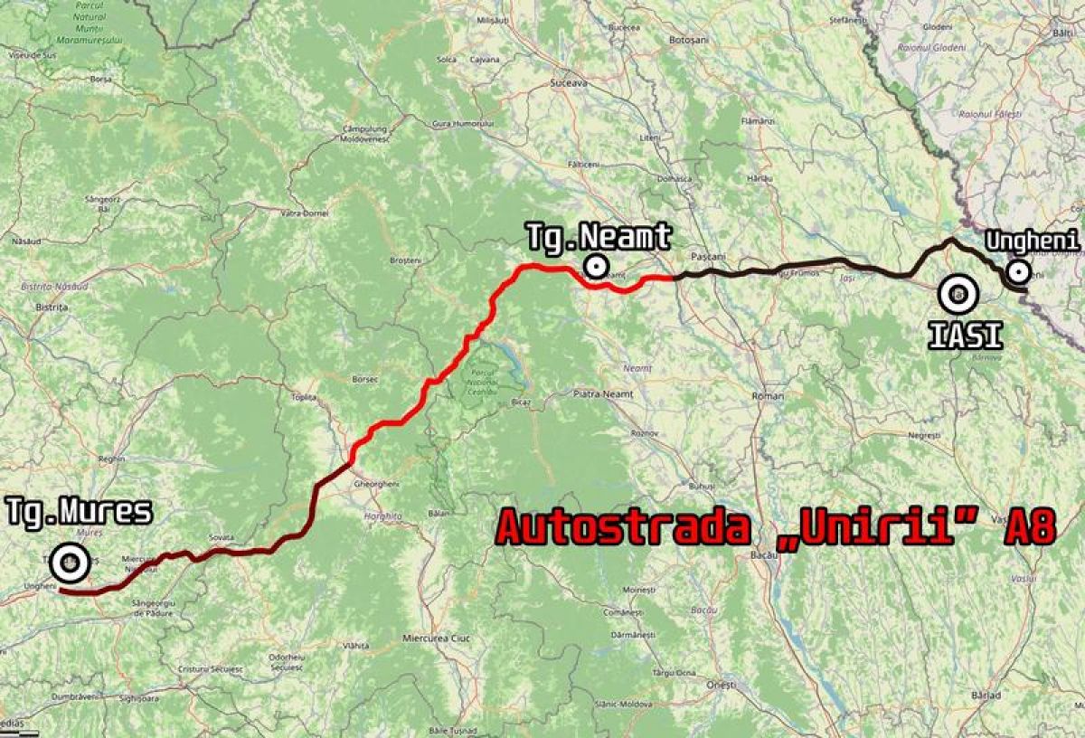 Autostrada Unirii A8 are aproape 320 km de la Târgu Mureș (intersecția cu A3) și până la Iași și Ungheni, la granița cu Republica Moldova.