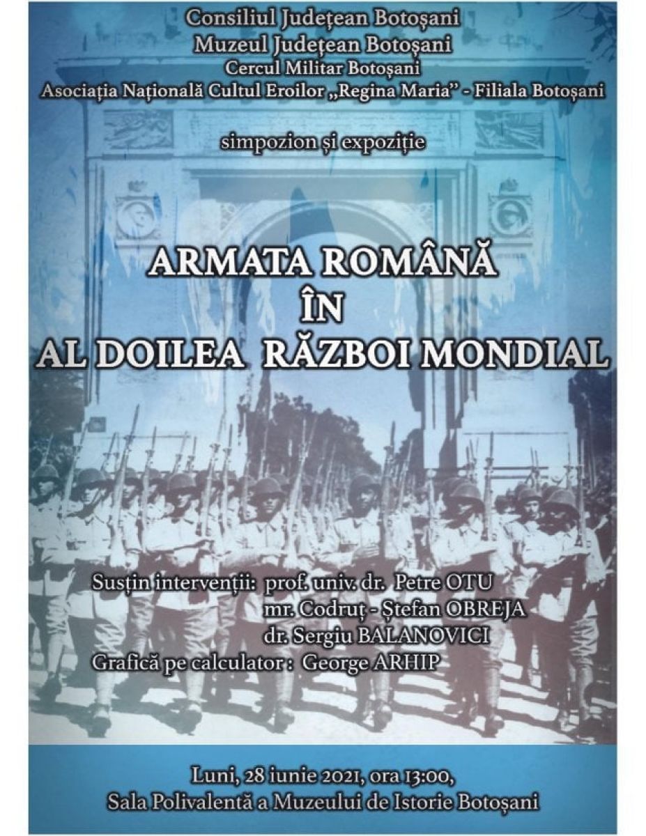 Muzeul Judeţean Botoşani organizează luni, 28 iunie 2021, ora 13.00, în Sala Polivalentă a Muzeului de Istorie Botoşani, simpozionul şi vernisajul expoziţiei Armata română în Al Doilea Război Mondial.