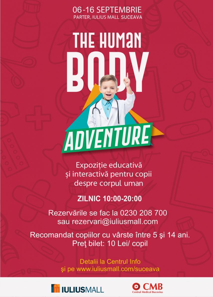 Ești curios și îți place să descoperi mereu lucruri noi? Învață totul despre corpul uman, la Iulius Mall Suceava! De joi, 6 septembrie 2018, te invităm la cea mai interactivă și educativă expoziție cu tematică medicală, o experiență recomandată copiilor cu vârste cuprinse între 5 și 14 ani. „The Human Body Adventure” este organizată de Iulius Mall Suceava, în parteneriat cu Centrul Medical Bucovina, și beneficiază de sprijinul Universității de Medicină și Farmacie „Grigore T. Popa” Iași. Vezi ce ți-am pregătit pe pagina de Facebook Iulius Mall Suceava!