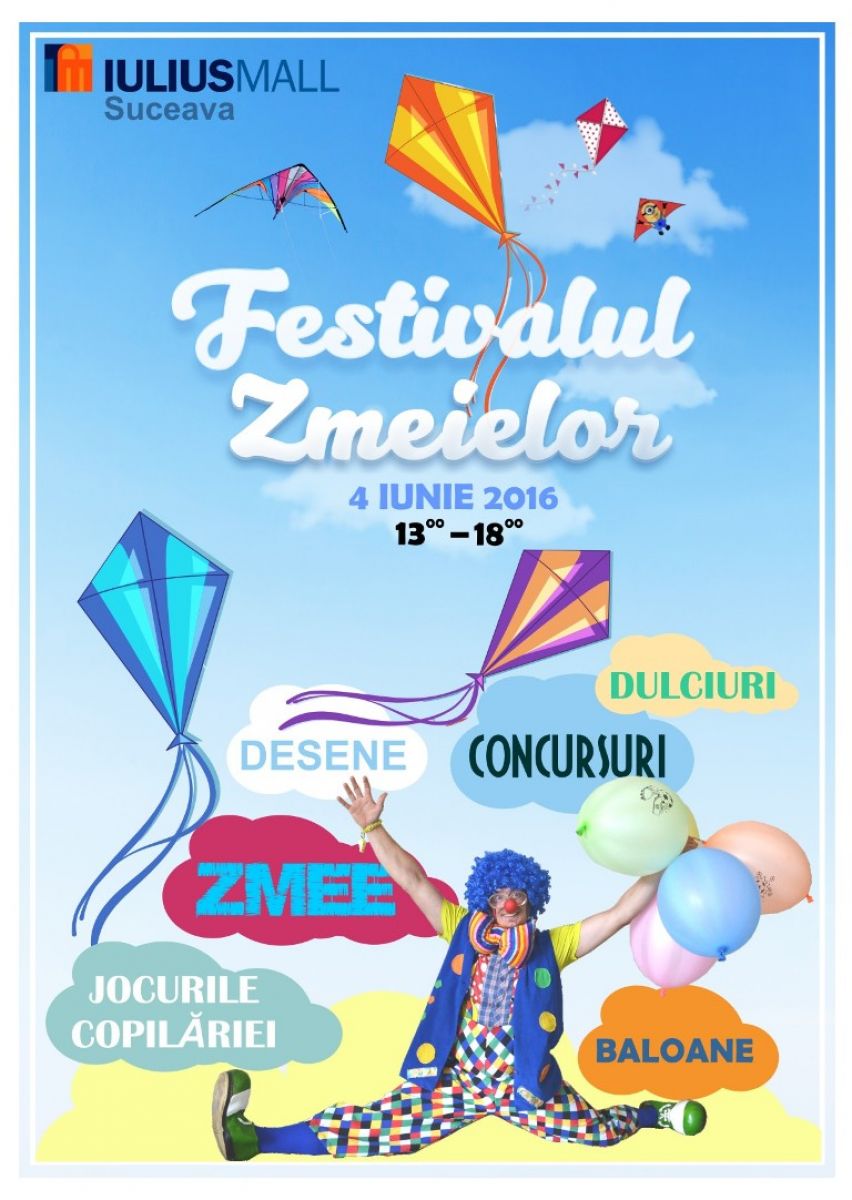 Iulius Mall Suceava continuă să îi surprindă pe cei mici și în week-end, atunci când îi așteaptă alte activități amuzante. Sâmbătă, 4 iunie, de la ora 13.00, esplanada Iulius Mall va găzdui Festivalul Zmeielor. Toți copiii prezenți vor primi câte un zmeu, pe care îl vor lansa alături de prieteni. Cursa lor va fi răsplătită cu premii și surprize dulci. Totodată, zona magazinelor pentru copii din Iulius Mall va deveni un spațiu desprins din desene animate, de unde nu vor lipsi clovnul Bobo, Minnie și Mickey Mouse, Sponge Bob, Minionul Kevin și zânele. În plus, continuă sesiunile de jocuri interactive specifice celei mai frumoase vârste. Iar pentru ca toți prichindeii să se bucure din plin de surprizele pregătite, vor fi reluate sesiunile de facepainting și de fotografiere în spațiul special amenajat.