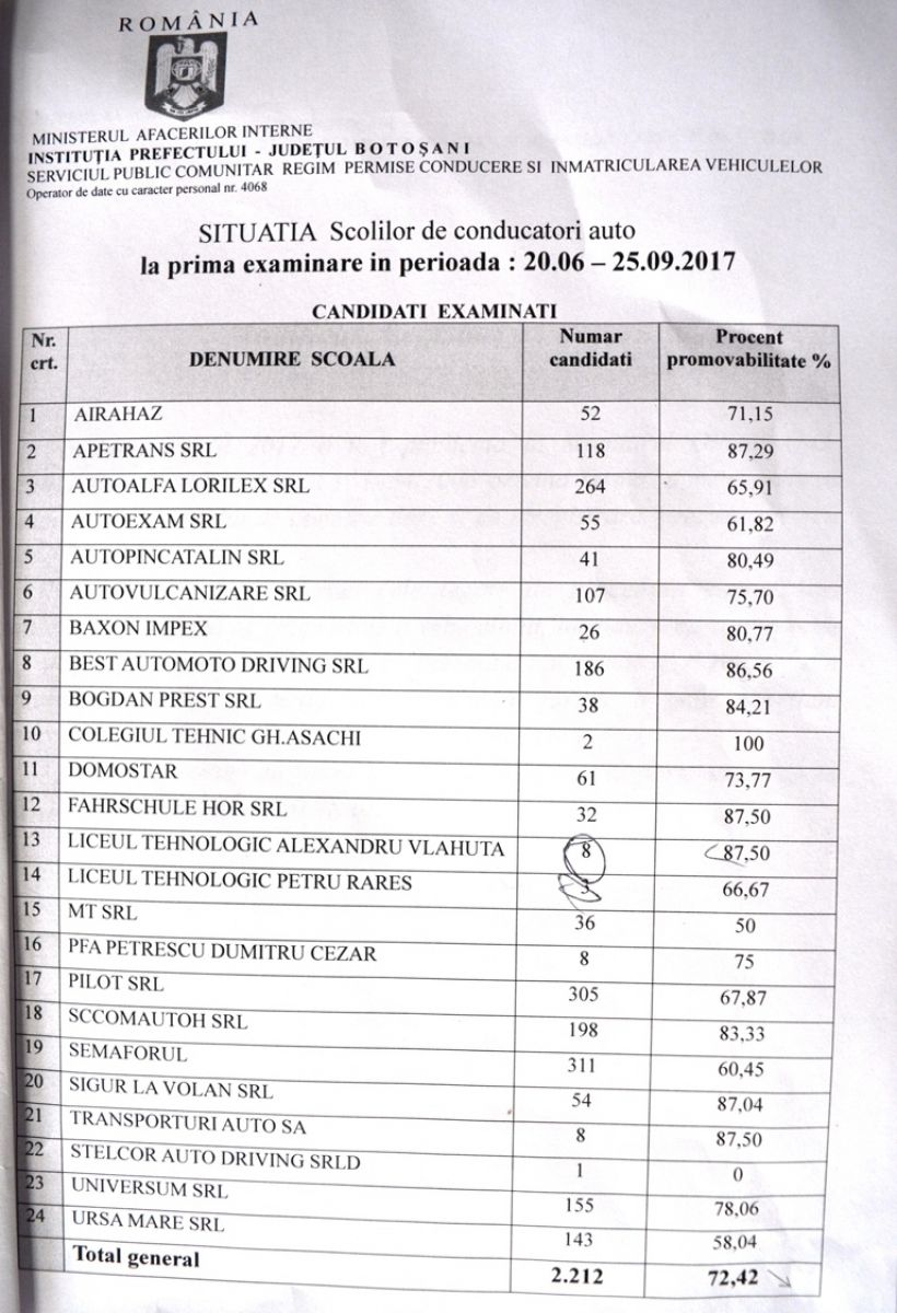 Astfel, în județul Botoșani, în perioada 20 iunie - 25 septembrie 2017 au fost examinați 7.134 de candidați, însă doar 4.404 au reușit să promoveze acest examen.