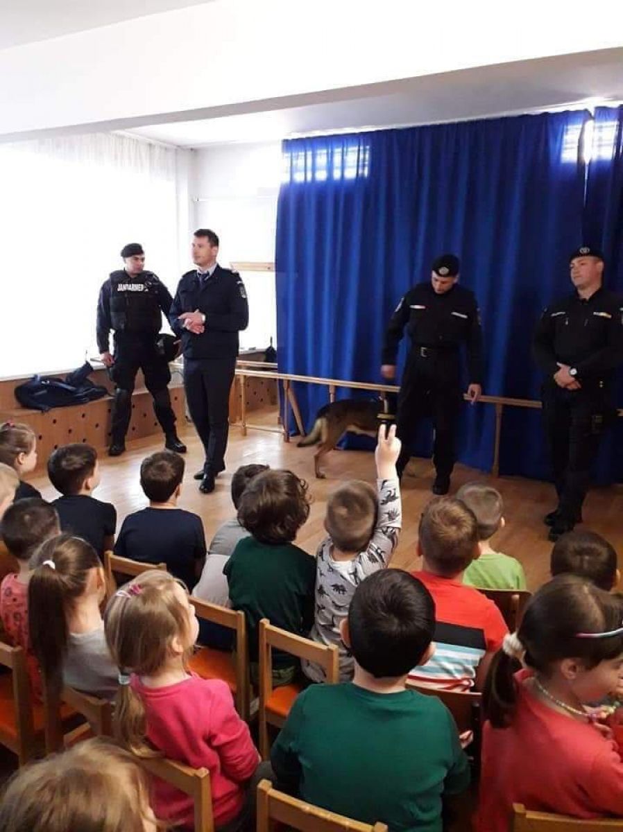 De asemenea, copiii au făcut ,,cunoștință” cu câinele de serviciu Pih, cel care a devenit o ,,emblemă” a jandarmilor și punctul de atracție principal la activitățile de acest gen, organizate în cadrul programului ,,Școala Altfel”.
