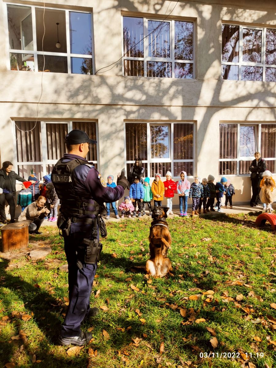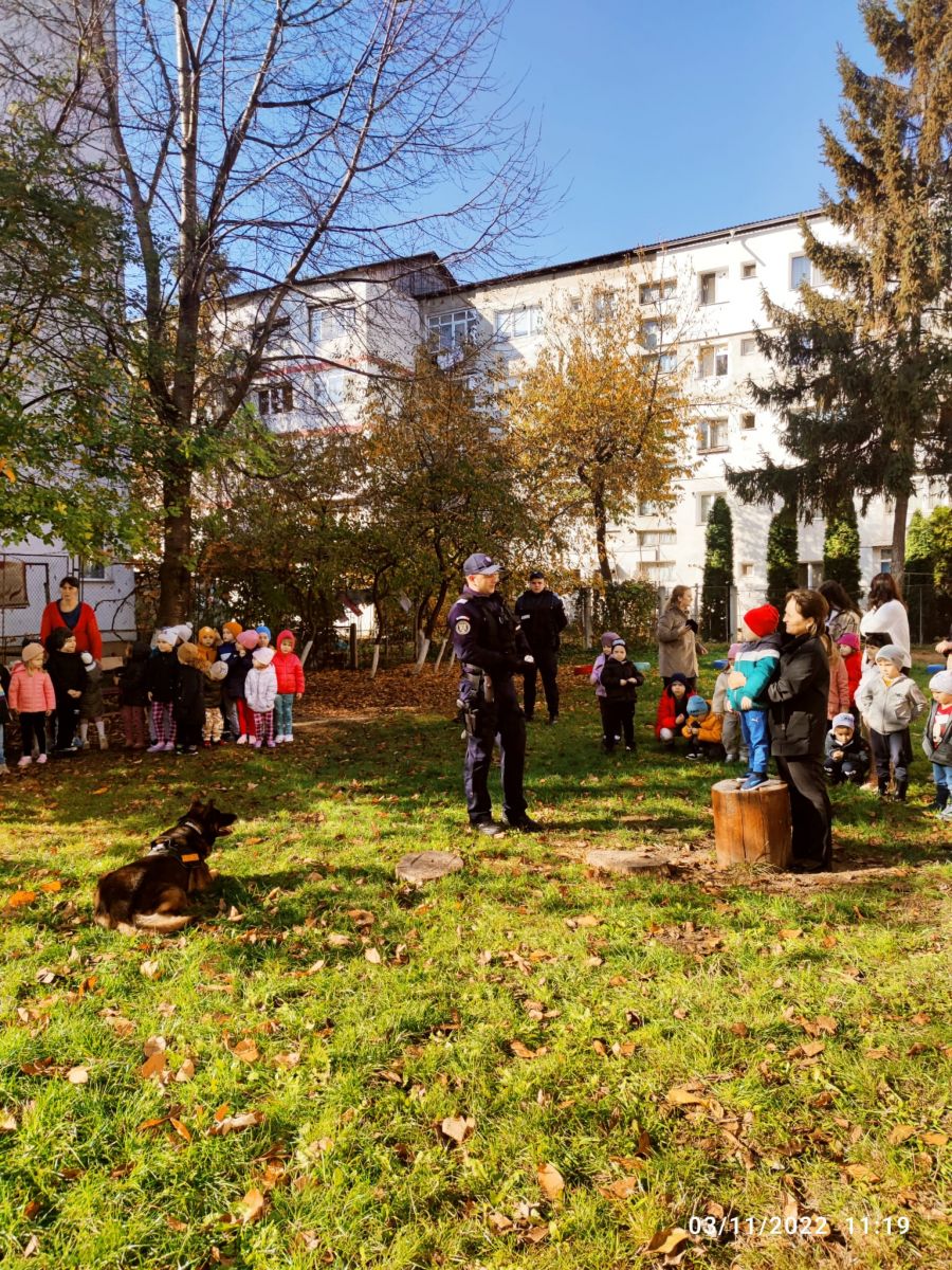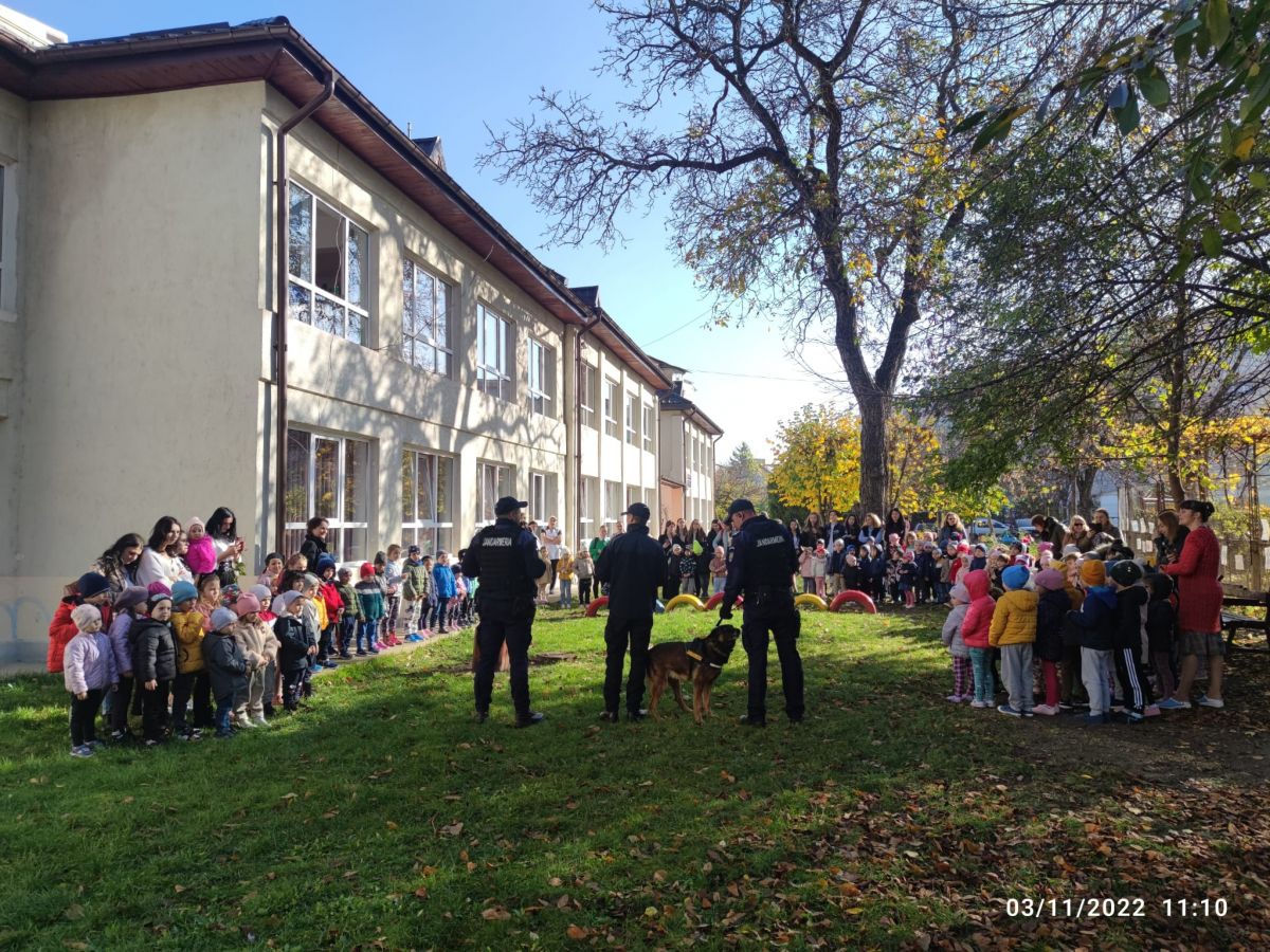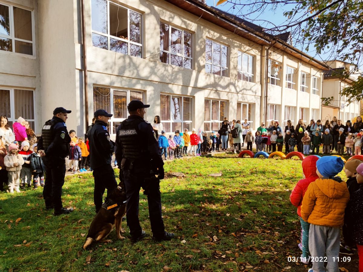 Pentru că cei mici îndrăgesc cățeii, jandarmii au fost însoțiți de câinele de serviciu Pih, spre încântarea copiilor.