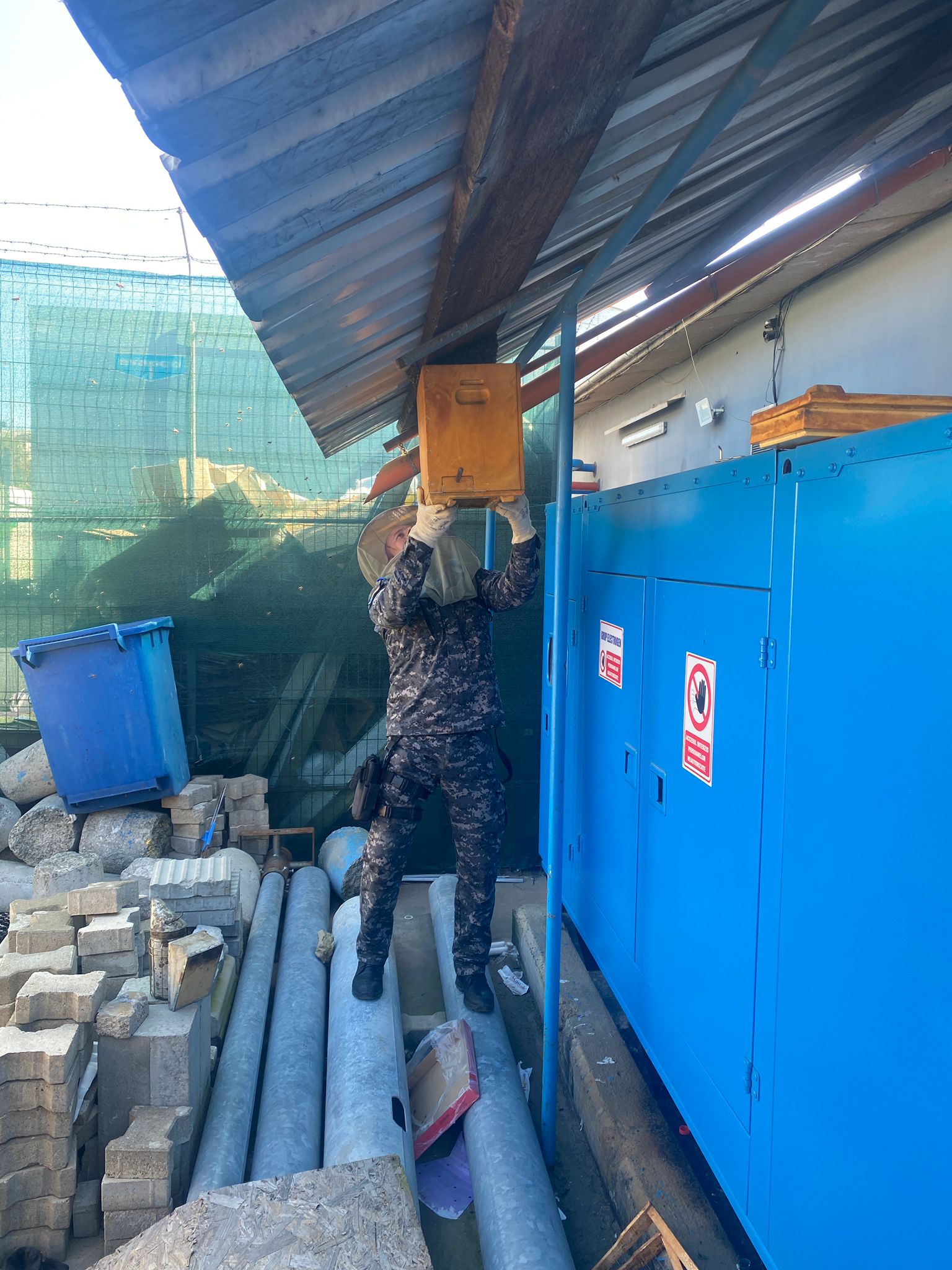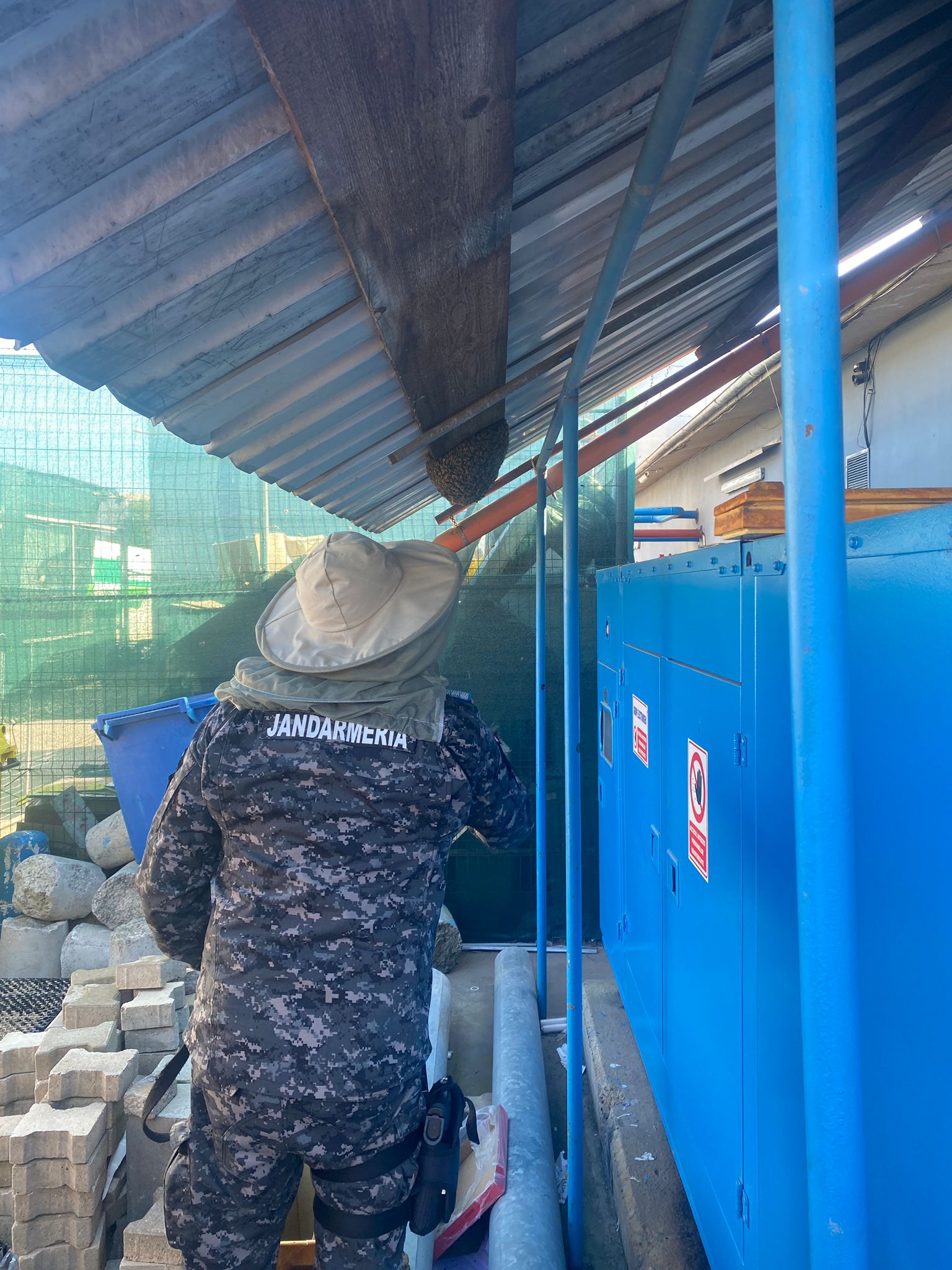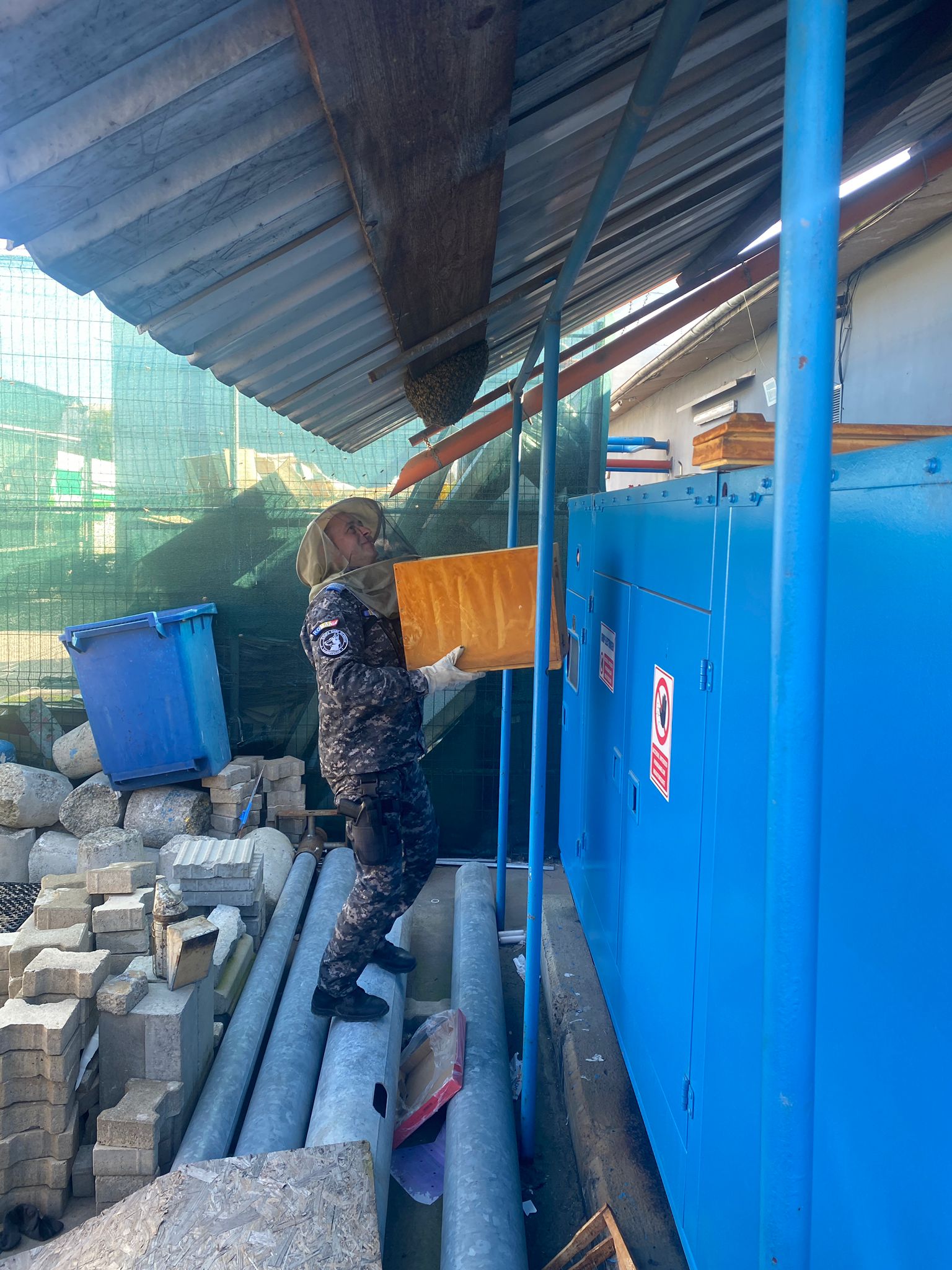 Având în vedere pericolul potențial și căldura care agită albinele, plutonierul adjutant șef Parasca Ovidiu, apicultor amator, a capturat roiul cu ajutorul unei cutii speciale pentru prinderea acestora.