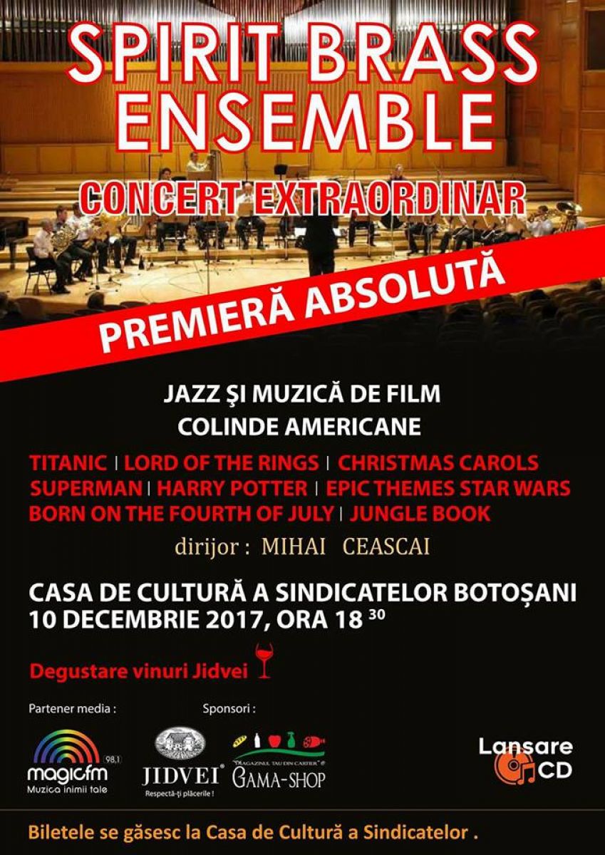 Spectacolul va începe la ora 18:30 şi va cuprinde inclusiv lansarea unui CD cu muzică de film în interpretarea “Spirit Brass Ensemble”.