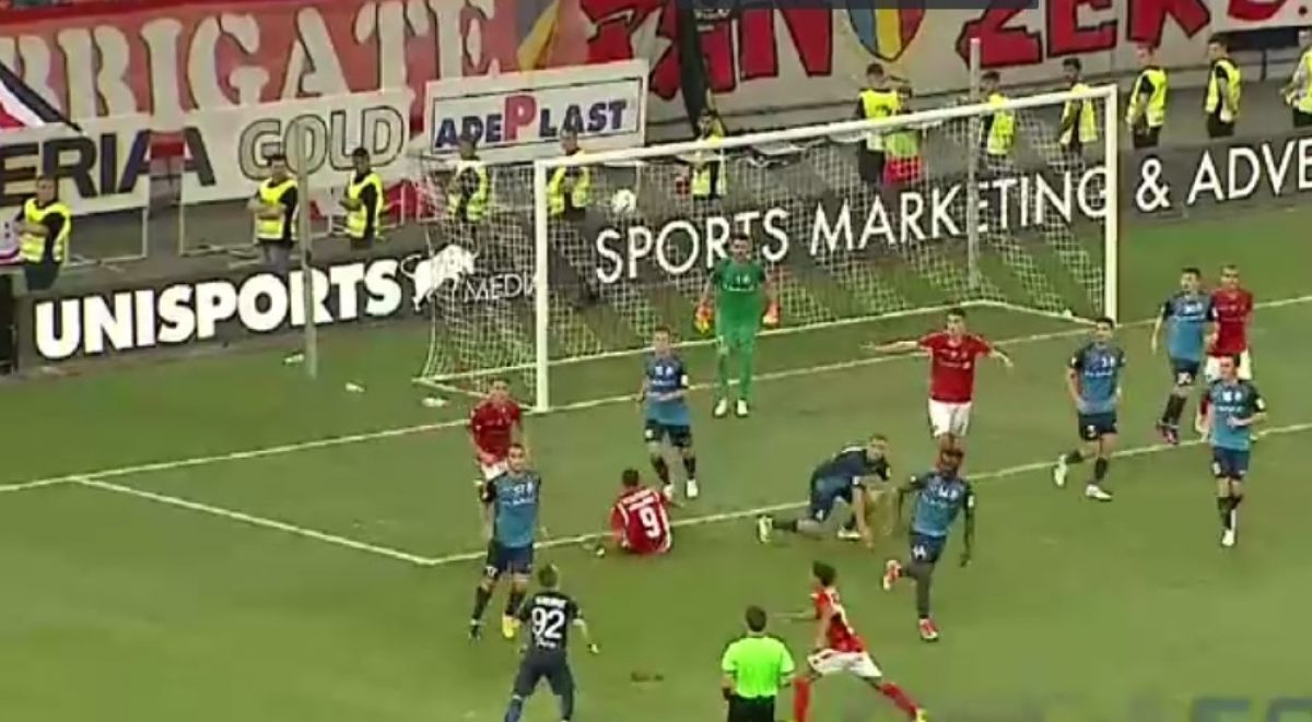 Istvan Kovacs, arbitrul partidei, a lăsat jocul să continue, spre nemulțumirea celor din tabăra ”câinilor”, care au solicitat o lovitură de la 11 metri la intervenția lui Kuku și a lui Miron.
