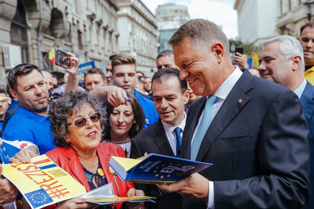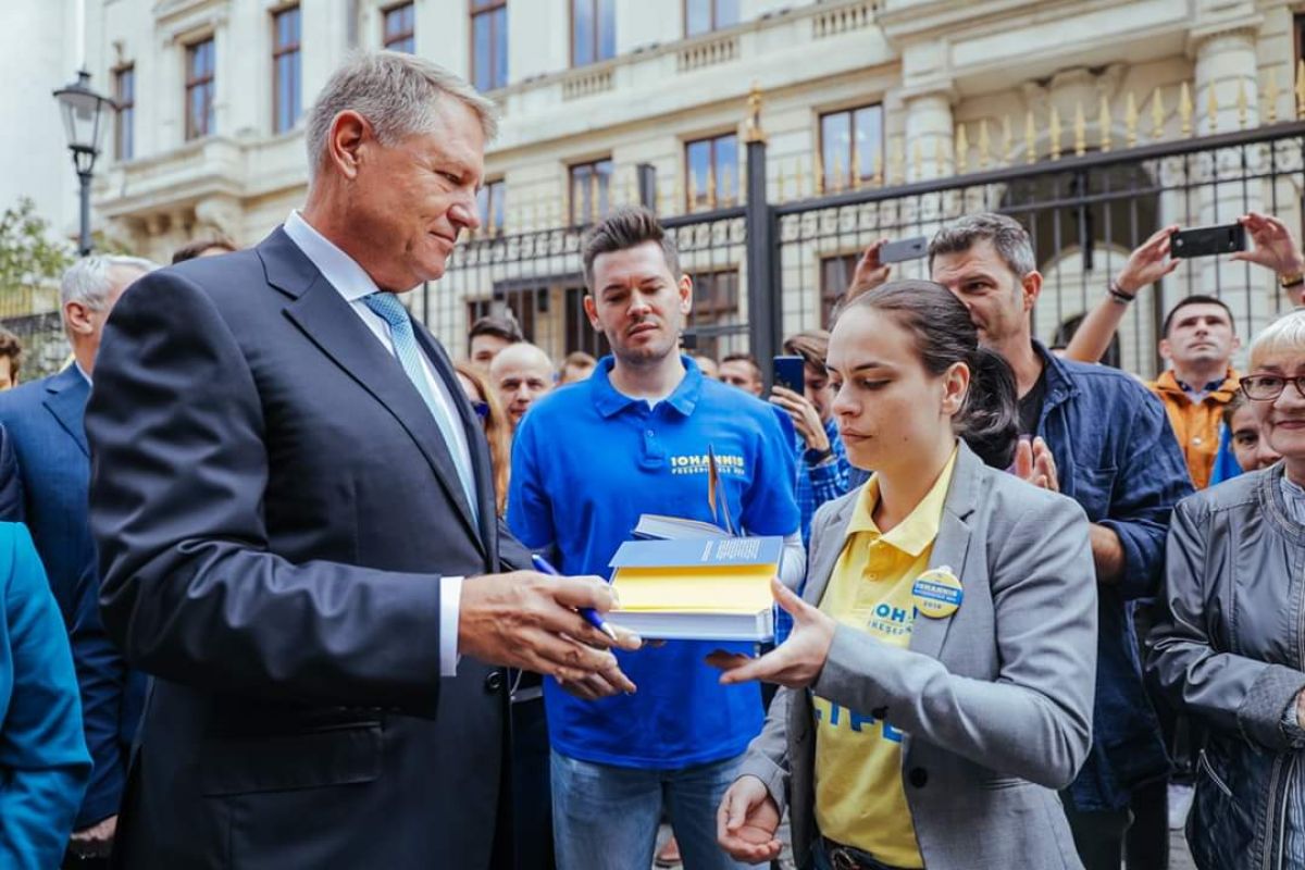 La plecare, președintele Klaus Iohannis a salutat oamenii veniți să își arate sprijinul pentru obținerea unui nou mandat de președinte al României și a răspuns cu simpatie la numeroasele solicitări de selfie-uri și autografe.
