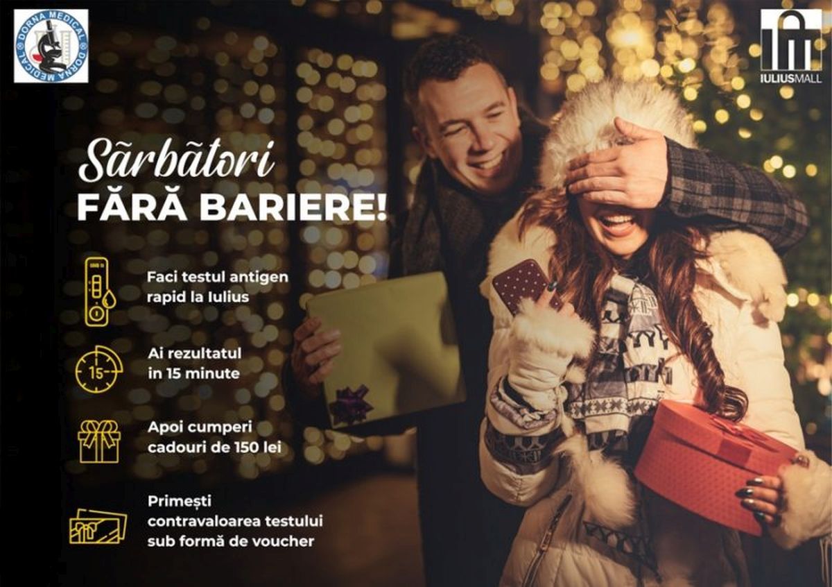 Sărbători fără bariere, la mall! Ca urmare a recentelor măsuri adoptate de autorităţi pentru prevenirea şi combaterea efectelor pandemiei de Covid-19, accesul în Iulius Mall Suceava se poate face şi pe baza unui test antigen rapid nu mai vechi de 48 ore sau a unui test PCR cu valabilitate 72 de ore.