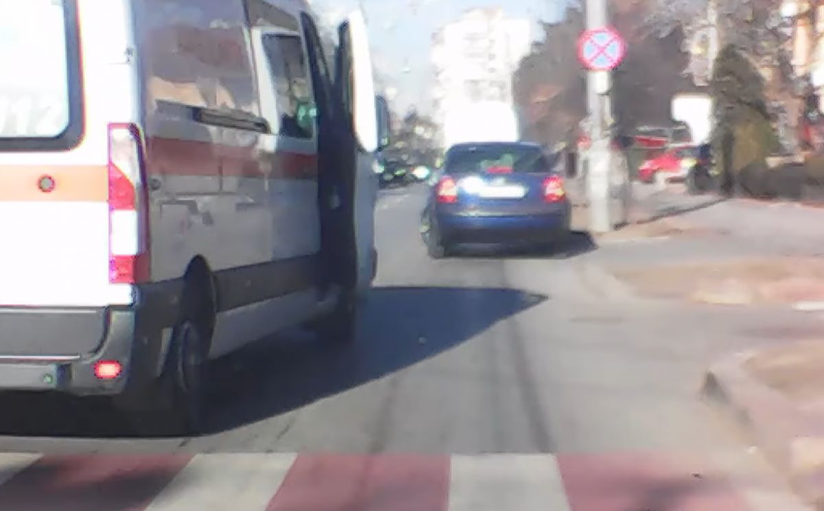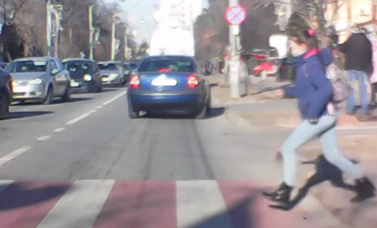 Trecere de pietoni, Bulevardul Mihai Eminescu, zona unui liceu. Participanții la trafic aud sirenele ambulanței și încearcă să elibereze calea, inclusiv conducătorii auto aflați în zona trecerii de pietoni.