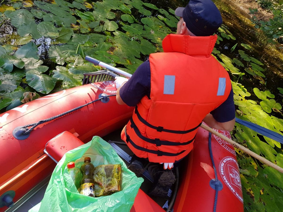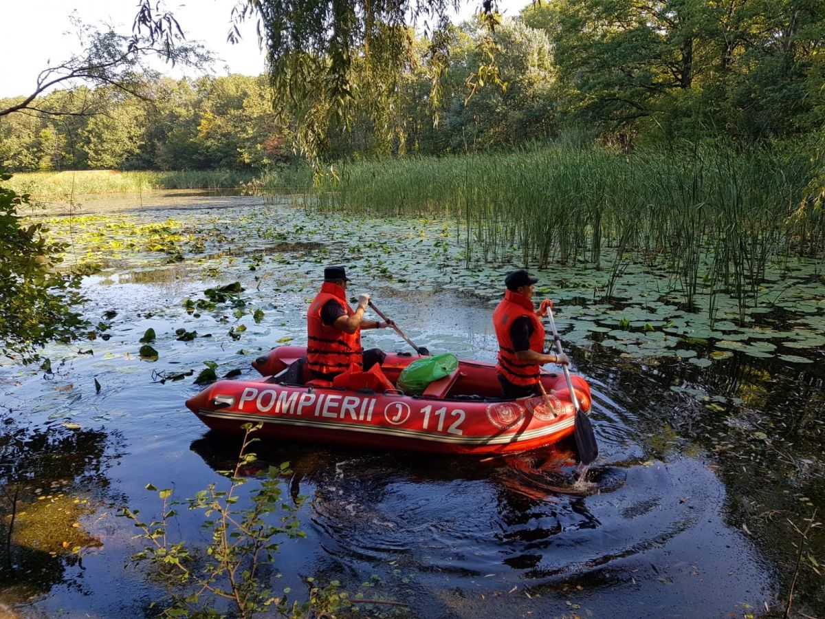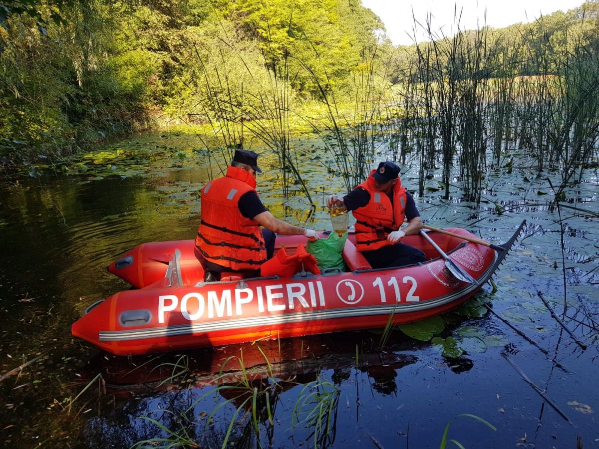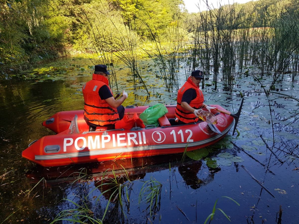 Pompierii din municipiul Botoșani curăță în aceste momente Lacul cu nuferi de la Ipotești. Toate deșeurile sunt adunate în saci de gunoi verzi.