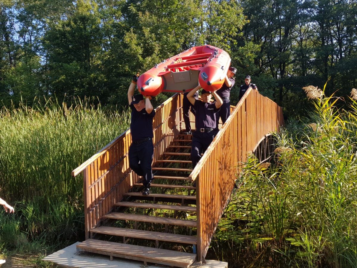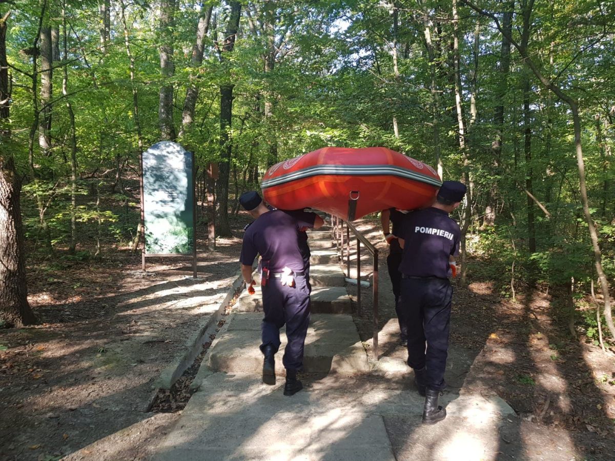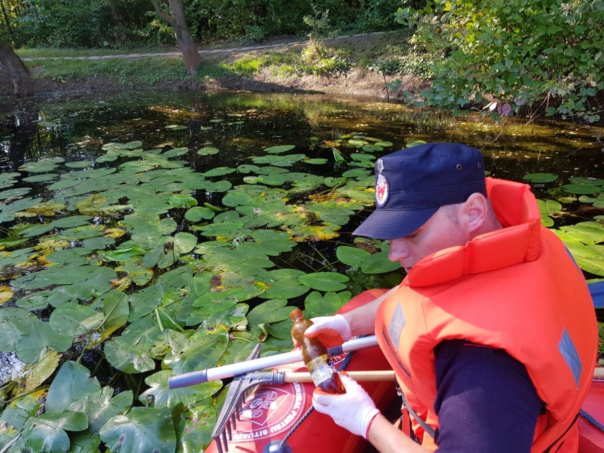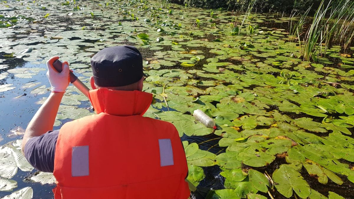 Pompierii din municipiul Botoșani curăță în aceste momente Lacul cu nuferi de la Ipotești. Toate deșeurile sunt adunate în saci de gunoi verzi.