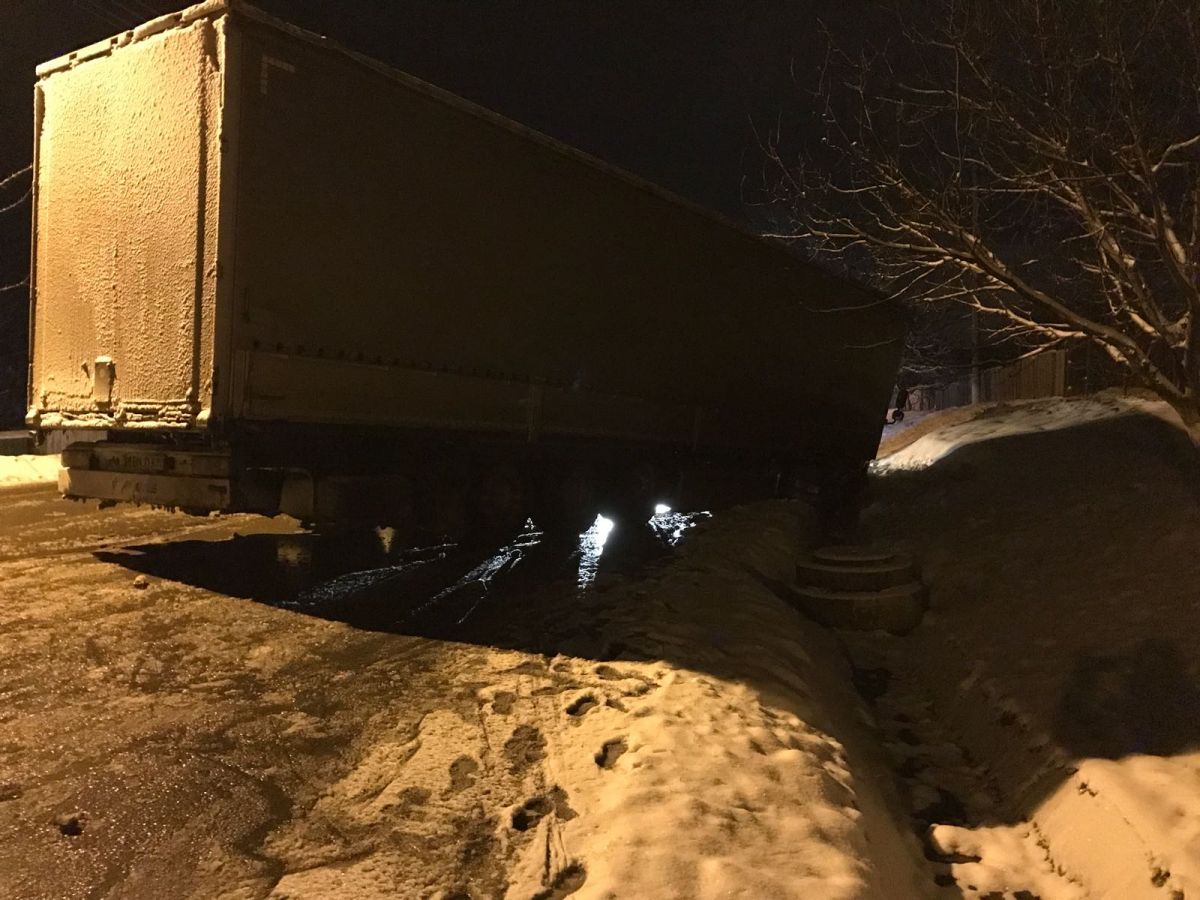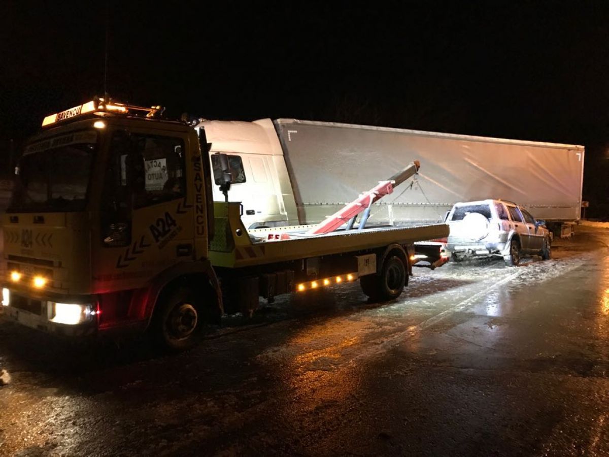 Un camion înmatriculat în Bistrița-Năsăud a derapat într-o curbă pe drumul acoperit cu gheață și zăpadă.