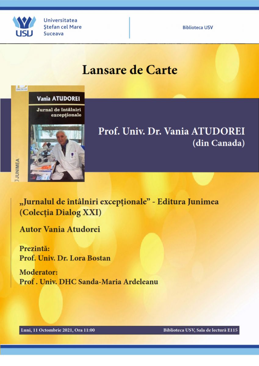 Volumul intitulat ”Jurnal de întâlniri excepționale”, apărut la Editura ”Junimea” și semnat de prof.univ.dr. Vania Atudorei, va fi lansat astăzi, 11 octombrie, începând cu ora 11.00, în cadrul Bibliotecii Universitare sucevene.