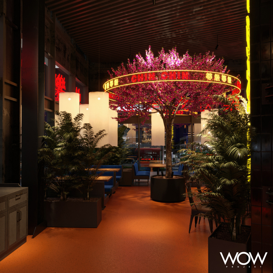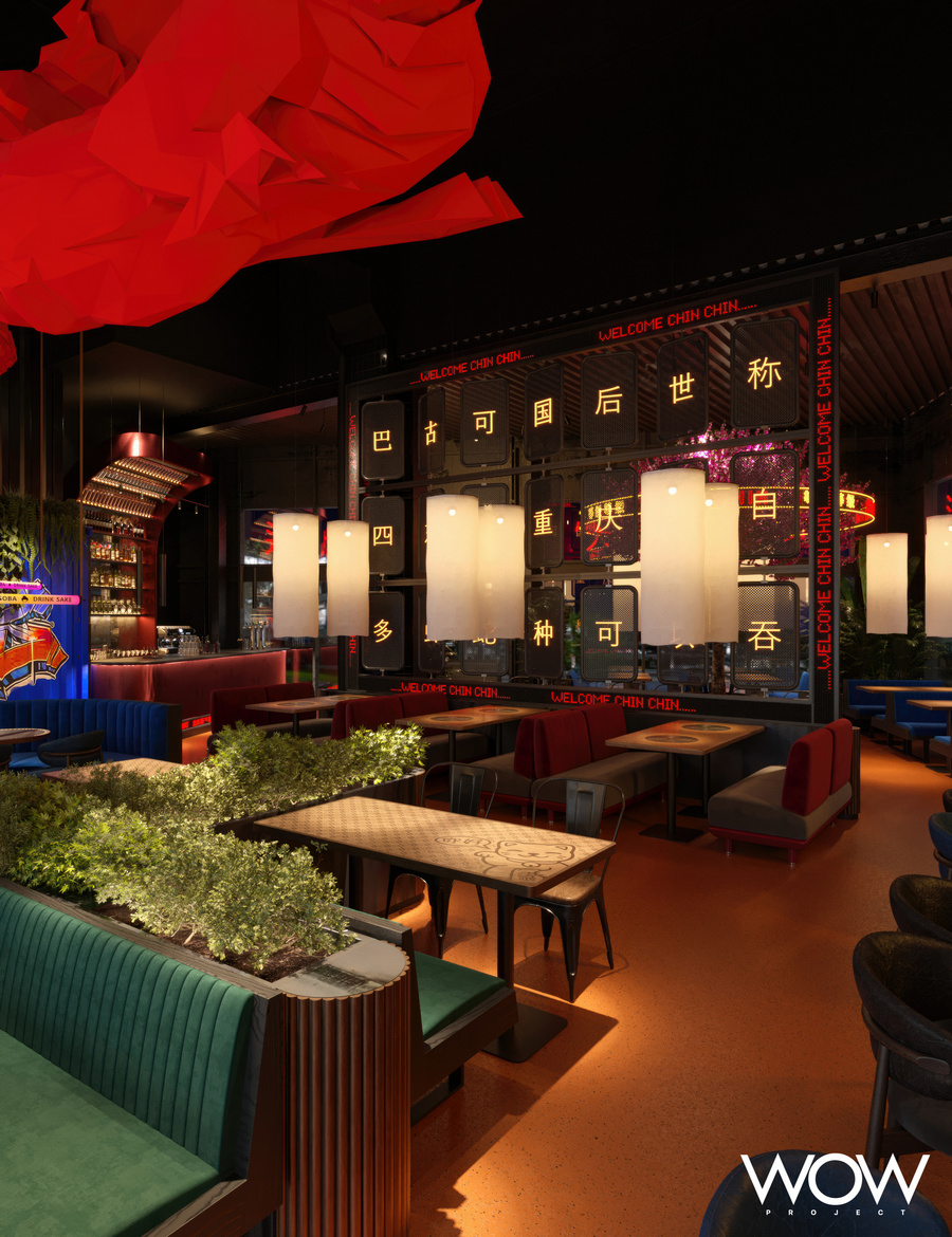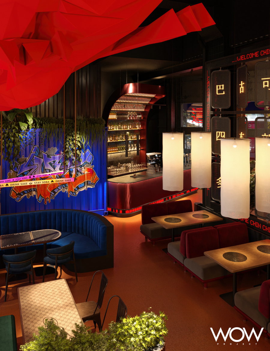 Conceptul de amenajare integrează simboluri asiatice și elemente de artă murală, pentru a oferi o atmosferă autentică, dar și un bar și bucătărie deschisă ce le permit oaspeților să-și vadă mâncarea în timp ce este pregătită. Un cireș japonez amplasat în centrul restaurantului îi va întâmpina pe oaspeți, transpunându-i în faimoasele grădini ale asiaticilor, iar decorul va fi completat de neoane și accente de culoare specifice artei stradale.