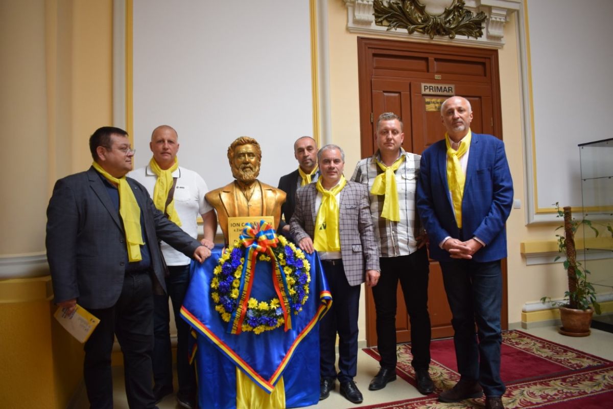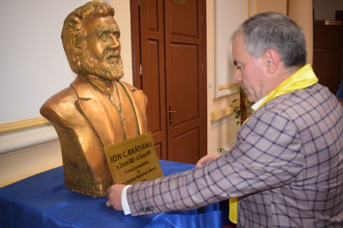 Maricel Maxim, „părintele” bustului a așezat și o plăcuță în fața statuii: „Aici avem primul președinte al PNL, este vorba de IC Brătianu născut în 1821, primul președinte al PNL. La mulți ani, PNL”.