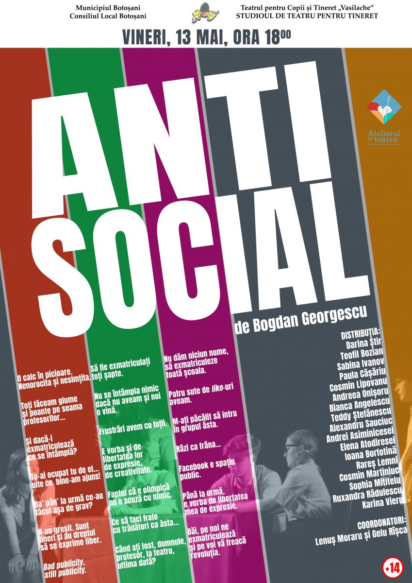 Vineri, 13 mai 2022, de la ora 18:00, la Teatrul pentru Copii și Tineret "Vasilache", în cadrul Studioului de Teatru pentru Tineret, este programat spectacolul ”Antisocial”, de Bogdan Georgescu.