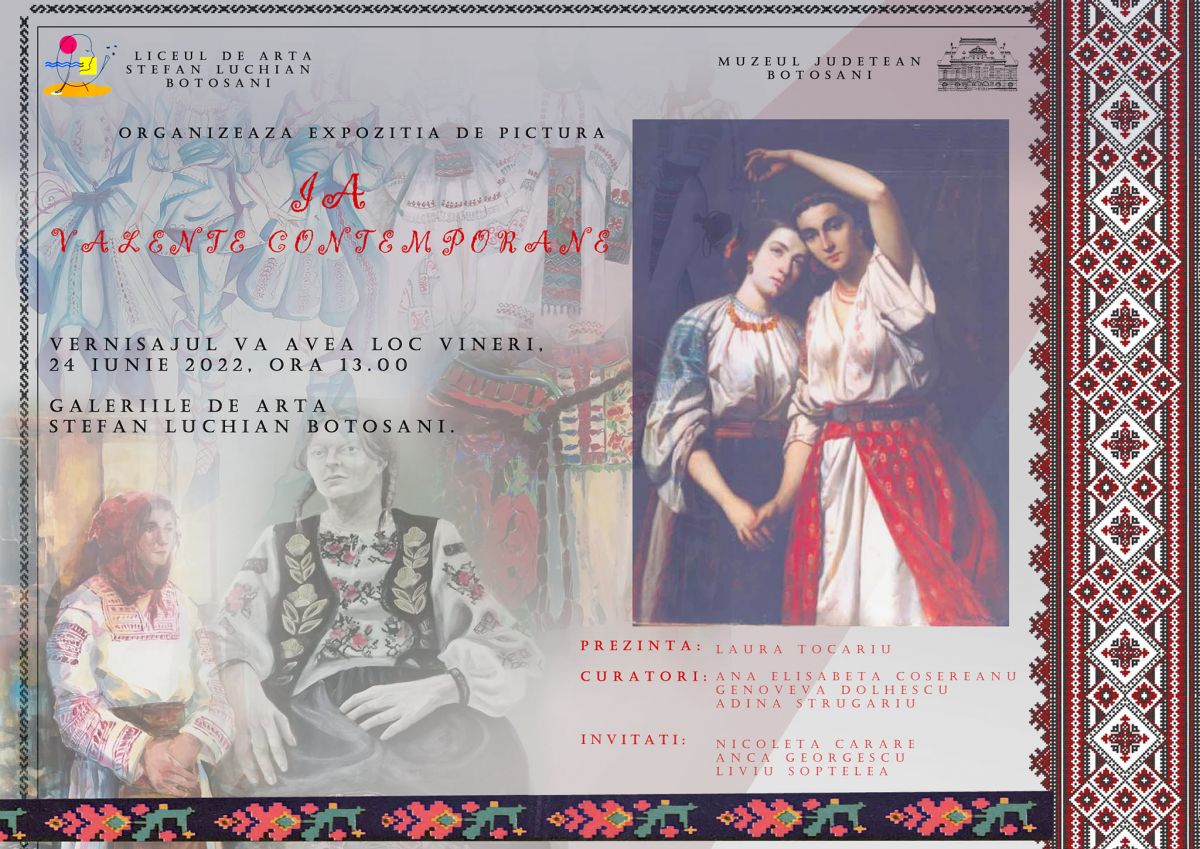 Vernisajul expoziţiei de pictură „Ia – valenţe contemporane”, organizată de Liceul de Artă „Ştefan Luchian” şi Muzeul Judeţean Botoşani, a fost o sărbătoare a creativităţii şi a portului popular românesc, expoziţie anuală şi, de ce nu, aşa cum şi-a manifestat gândul bun unul dintre curatori, profesor Genoveva Dolhescu, concurs de pictură având ca temă tradiţia milenară a acestui popor, ilustrată de talentul şi sensibilitatea mânuitorului de penel şi culoare de pretutindeni, astfel dorindu-se reunirea unor lucrări care vor contura specificul fiecărui colţ de ţară şi vor milita pentru reîntoarcerea la matca străveche a sufletului românesc.
