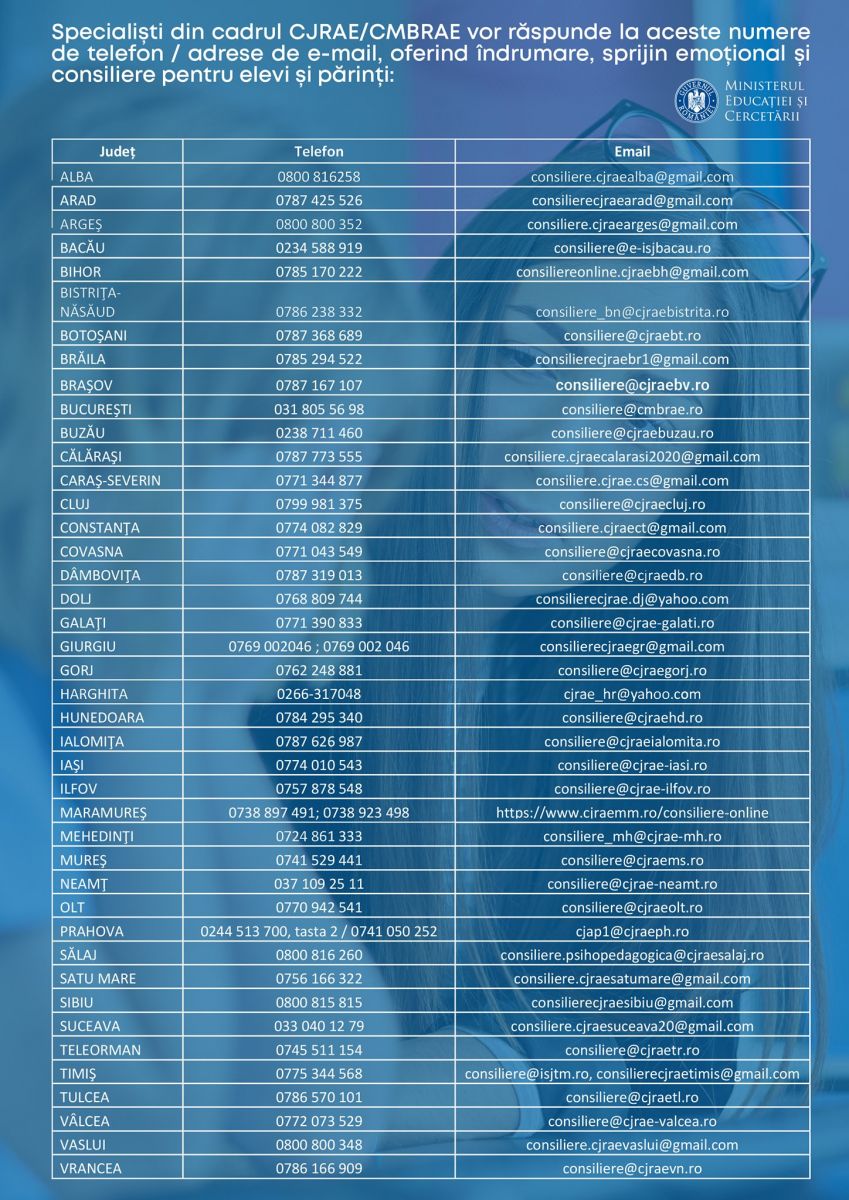 MEC a anunțat pe Facebook că specialiștii CJRAE vor oferi sprijin pentru a gestiona mai ușor o perioadă în care este nevoie de îndrumare, sprijin emoțional și consiliere.