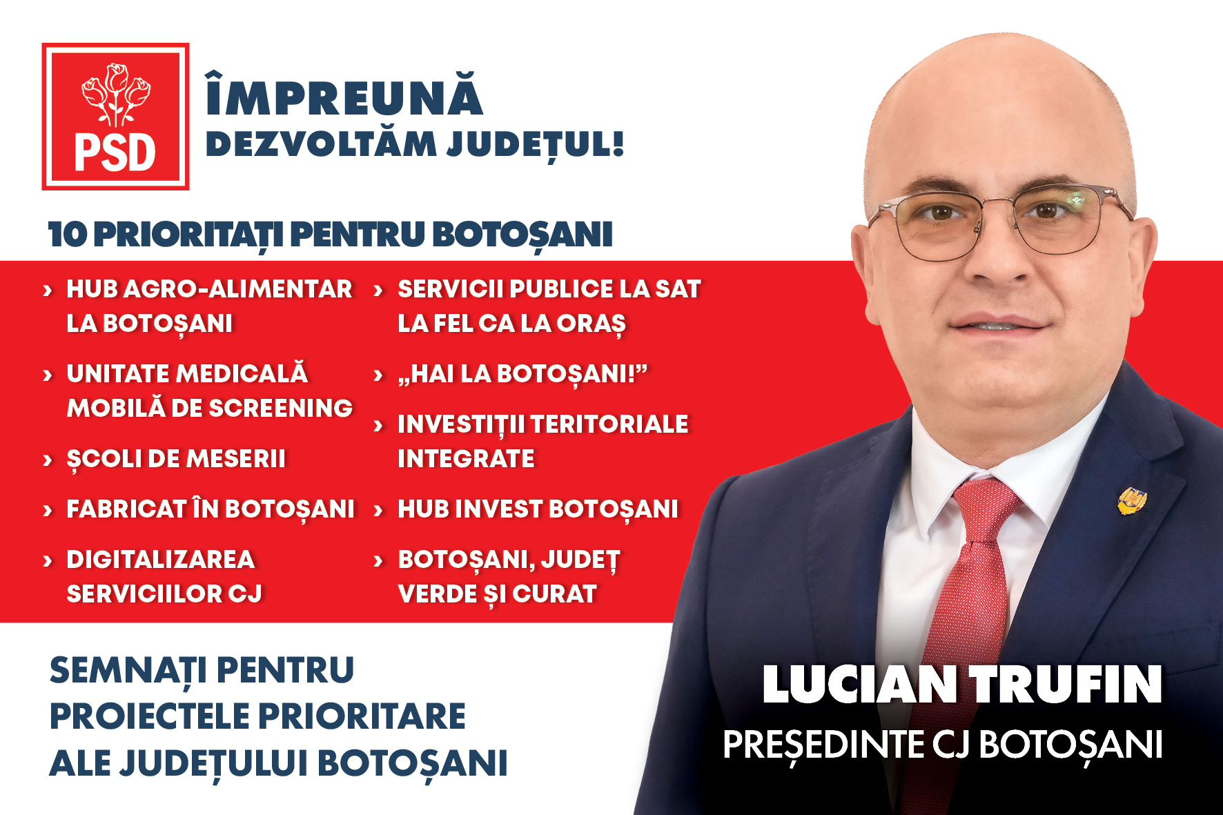 „10 pentru Botoșani reprezintă o sinteză a programului meu de guvernare locală pentru continuarea proiectelor de investiții realizate de colega mea, Doina Federovici. O atenție sporită este menținută către modernizarea infrastructurii rutiere, dotarea unităților medicale, extinderea serviciilor sociale, promovarea domeniului cultural și valorificarea turistică a județului.