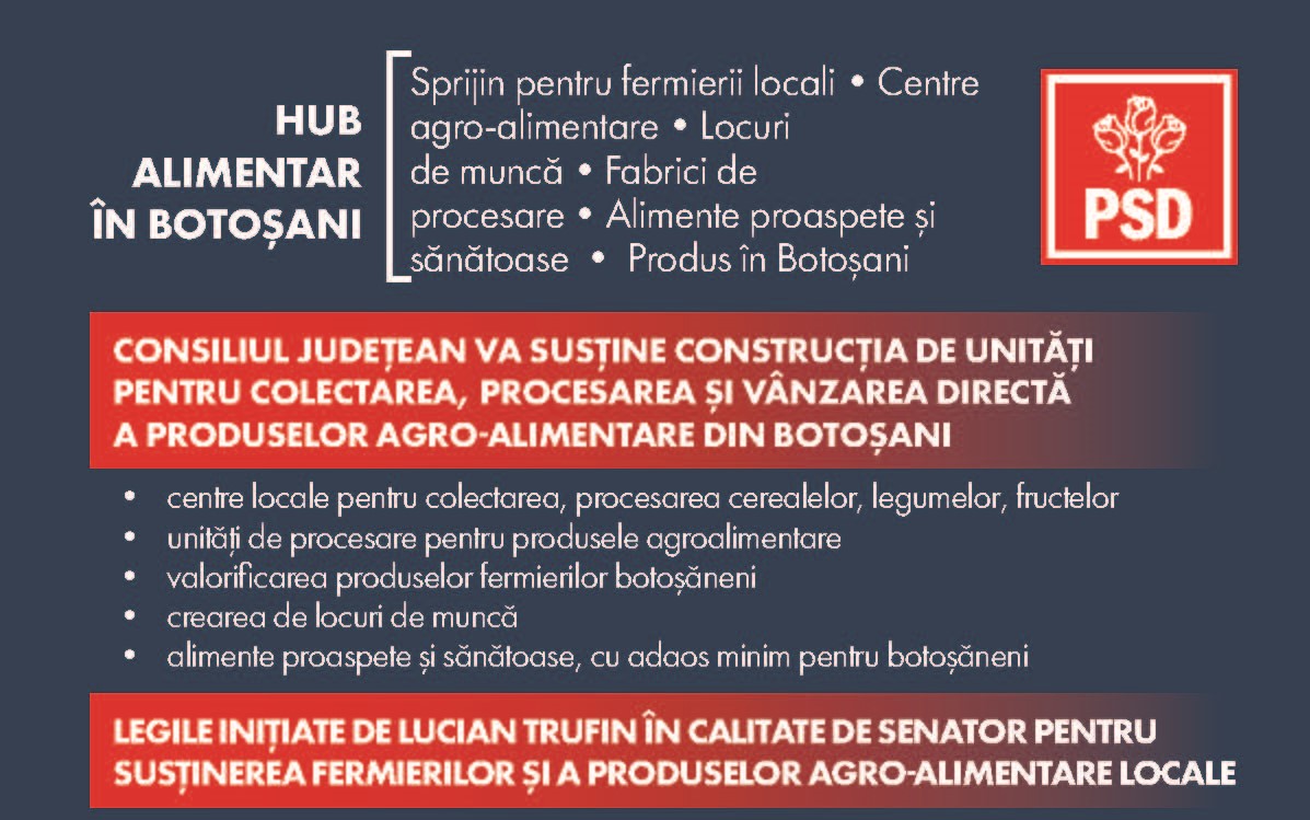 „Așa cum am reușit să sprijin ca senator cultivatorii locali prin proiectele de legi elaborate și prin programele guvernamentale adoptate, tot așa voi sprijini în calitate de președinte al Consiliului Județean toți fermierii botoșăneni, astfel încât hrana sănătoasă, de calitate să ajungă la toți locuitorii din județul Botoșani. Toți agricultorii din județul nostru vreau să știe că întotdeauna vor avea în mine un partener și un susținător al revigorării satului românesc și al produselor autohtone. Consiliul Județean va susține realizarea de centre locale pentru valorificarea produselor fermierilor botoșăneni pentru crearea de locuri de muncă și pentru susținerea produselor din Botoșani”, a declarat Lucian Trufin.