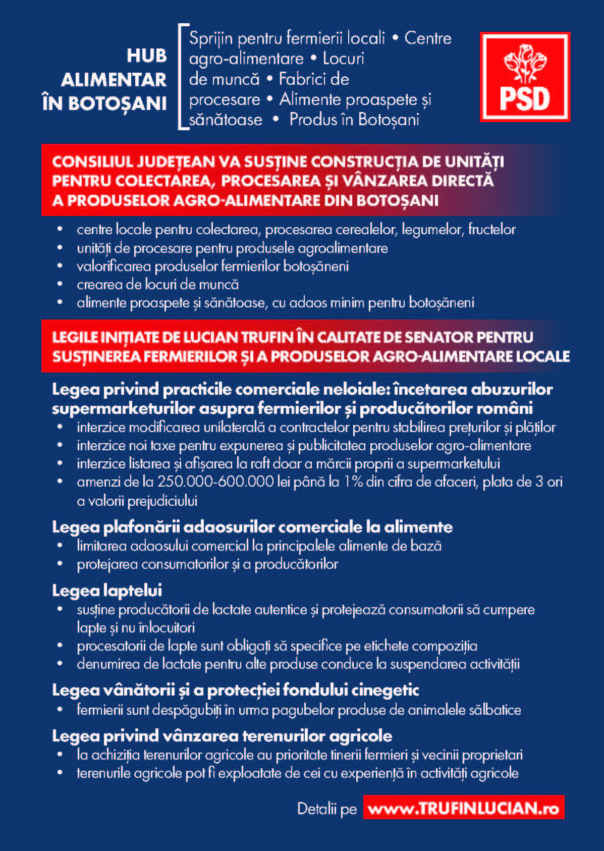 Candidatul PSD pentru funcția de președinte al Consiliului Județean Botoșani a făcut referire la faptul că împreună cu mulți dintre fermierii și producătorii locali a lucrat la mai multe proiecte legislative care astăzi sunt în vigoare: legea privind practicile comerciale neloiale, legea limitării adaosurilor comerciale la alimente, legea laptelui, legea vânătorii, legea privind vânzarea terenurilor agricole și multe altele.