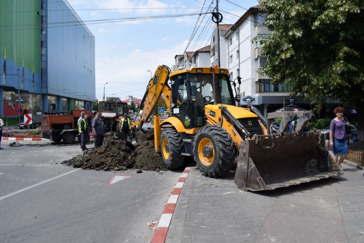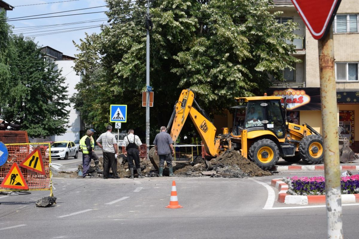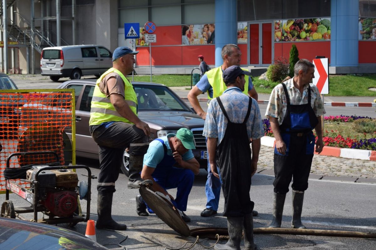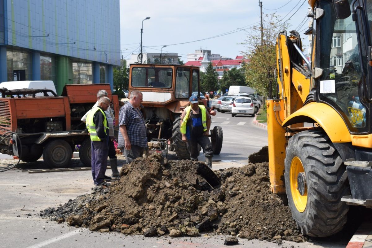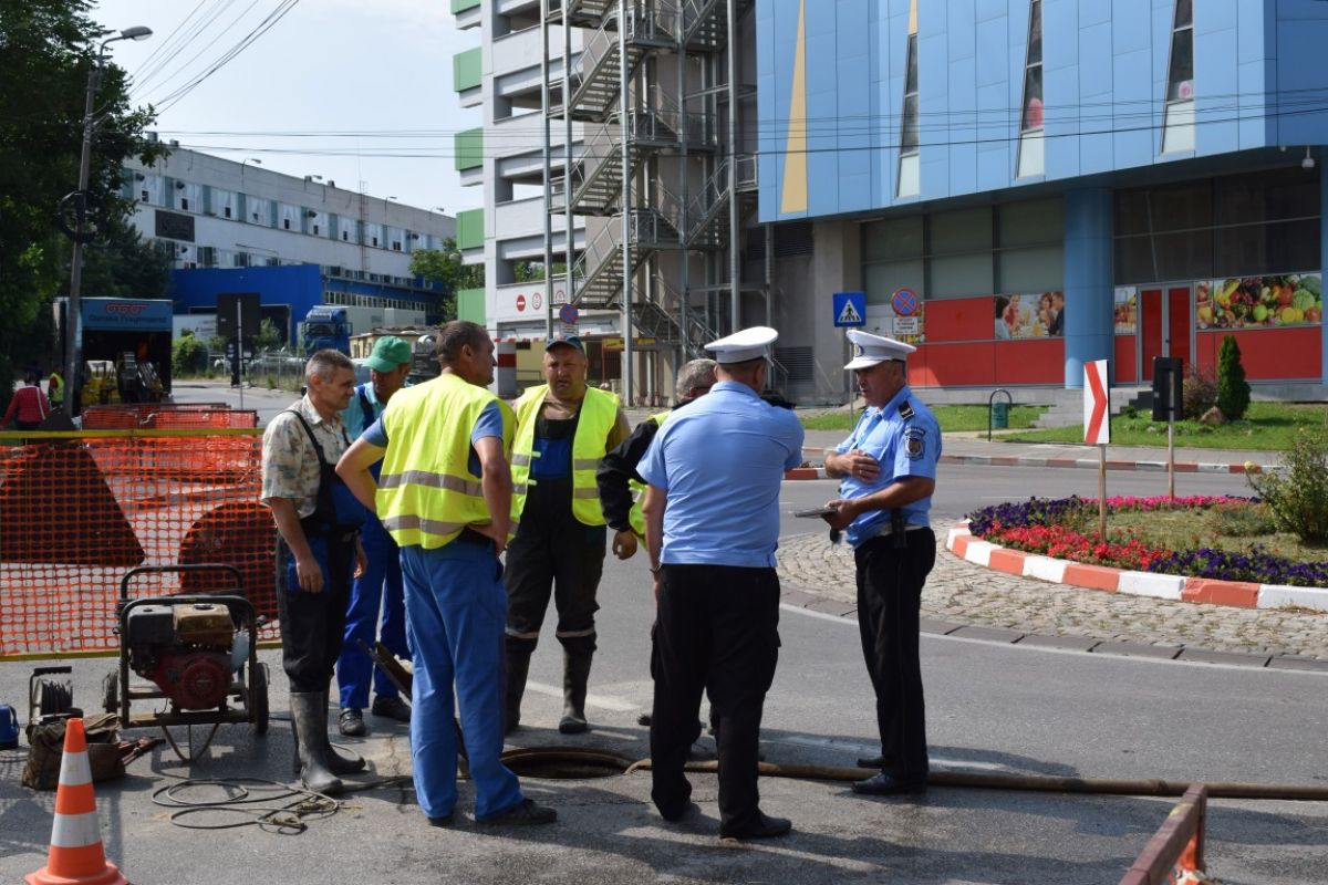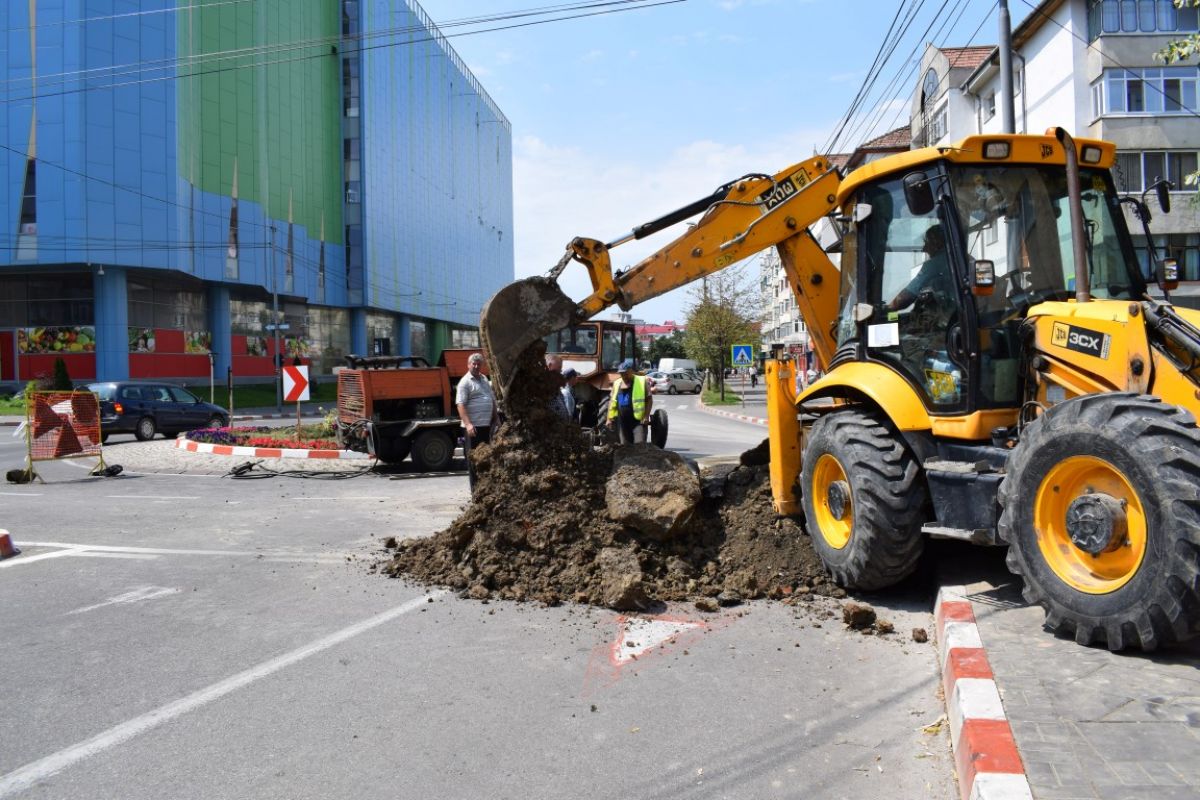 Astăzi, un boldo-excavator aparținând companiei de apă a fost nevoit să intervină la sensul giratoriu de lângă Uvertura Mall unde a săpat o groapă în carosabil pentru a ajunge la unui dintre cămine. Intervenția a fost monitorizată de directorul de exploatare, Ady Petrușcă.