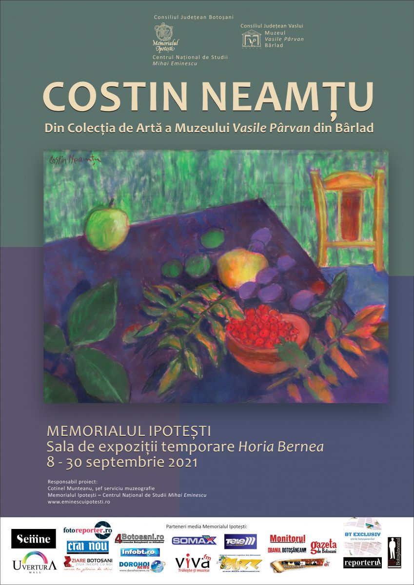 Memorialul Ipoteşti – Centrul Naţional de Studii „Mihai Eminescu”, în colaborare cu Muzeul de Istorie „Vasile Pârvan” din Bârlad, organizează, în perioada 8-30 septembrie 2021, în sala Horia Bernea a Memorialului Ipoteşti, expoziţia de pictură ce reuneşte, pe simeze, o parte din lucrările de artă ale renumitului pictor Costin Neamțu, născut în anul 1939 în localitatea Liteni din județul Suceava.