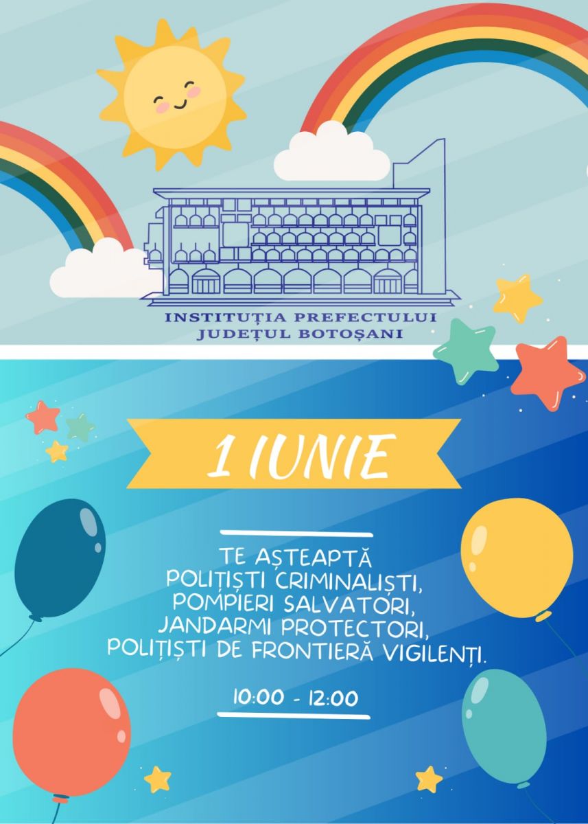 Instituția Prefectului – Județul Botoșani, împreună cu Inspectoratul de Poliție Județean, Inspectoratul Județean de Jandarmi, Serviciul Teritorial al Poliției de Frontieră și Inspectoratul pentru Situații de Urgență Botoșani organizează un eveniment special dedicat exclusiv copiilor, de 1 iunie.