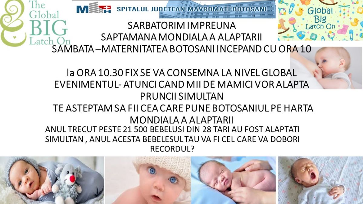 Mame care alăptează din întreaga lume se întâlnesc în locații stabilite și înregistrate pe site-ul The Global Big Latch On – Community Support for Breastfeeding pentru a „atașa la sân” (alăpta) simultan, la timpul stabilit de organizatori. Toate atașările sunt contabilizate, iar recordul urmează să se stabilească în perioada următoare. În Botoșani evenimentul s-a desfășurat sâmbătă 3 August ora 10.30, locația fiind Maternitatea Botoșani.