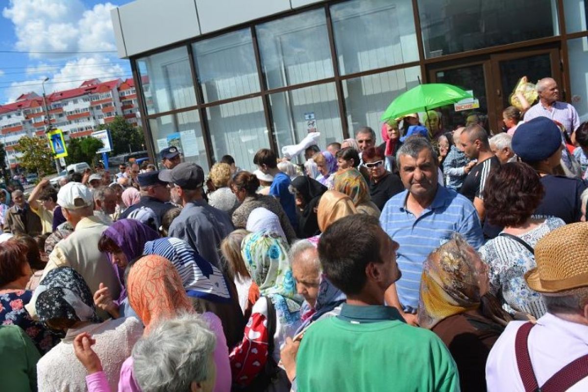 Zeci de oameni au așteptat aproape 60 de minute în soare pentru a primi la final o caserolă de mâncare.