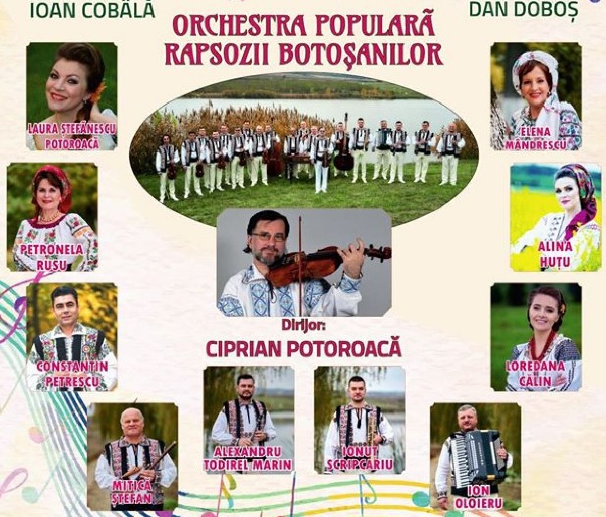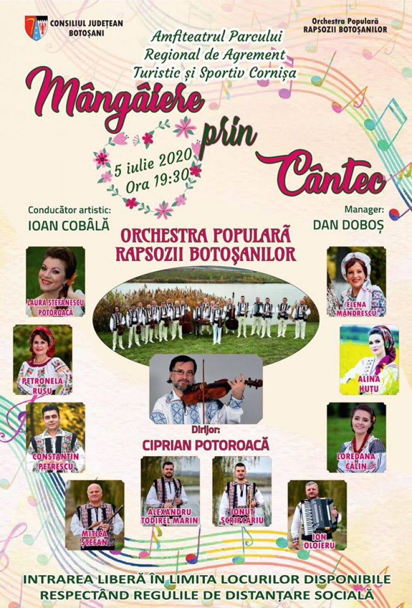 Orchestra Populară „Rapsozii Botoșanilor” invită publicul în ziua de 5 iulie 2020, începând cu ora 19.30, la spectacolul „Mângâiere prin cântec”.