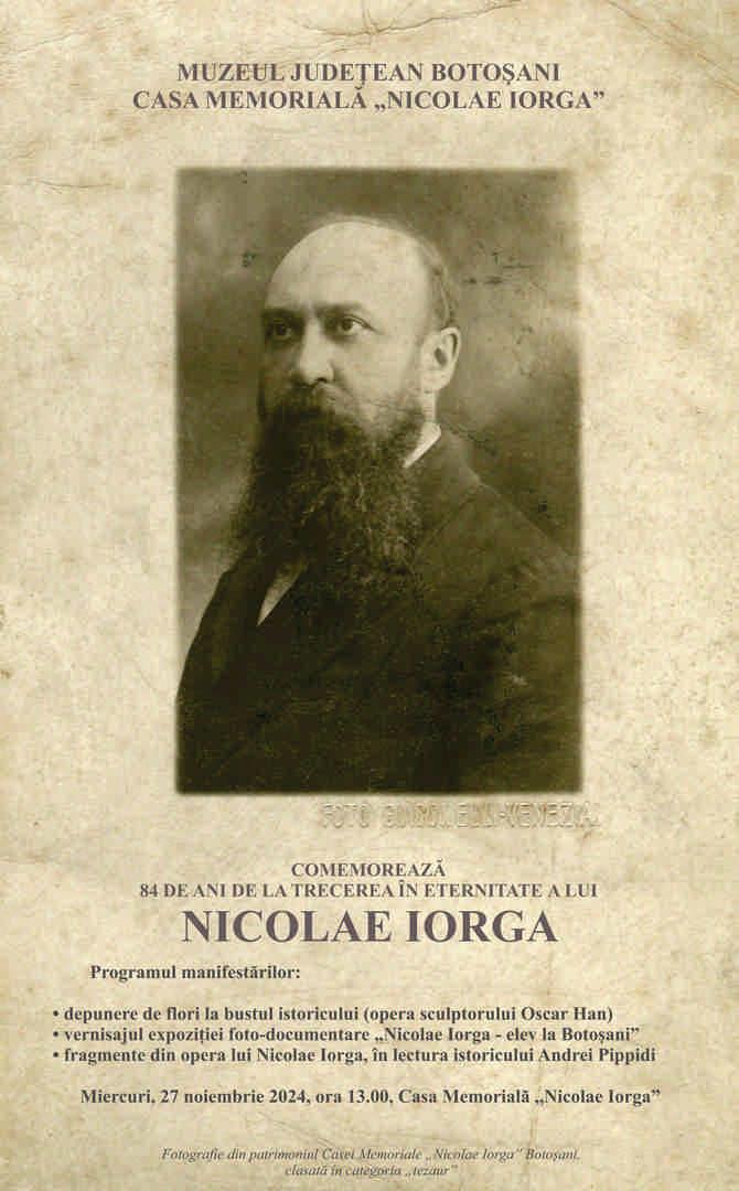 Muzeul Județean Botoșani organizează miercuri, 27 noiembrie 2024, ora 13:00, la Casa Memorială „Nicolae Iorga”, manifestările prilejuite de împlinirea a 84 de ani de la trecerea în eternitate a istoricului.