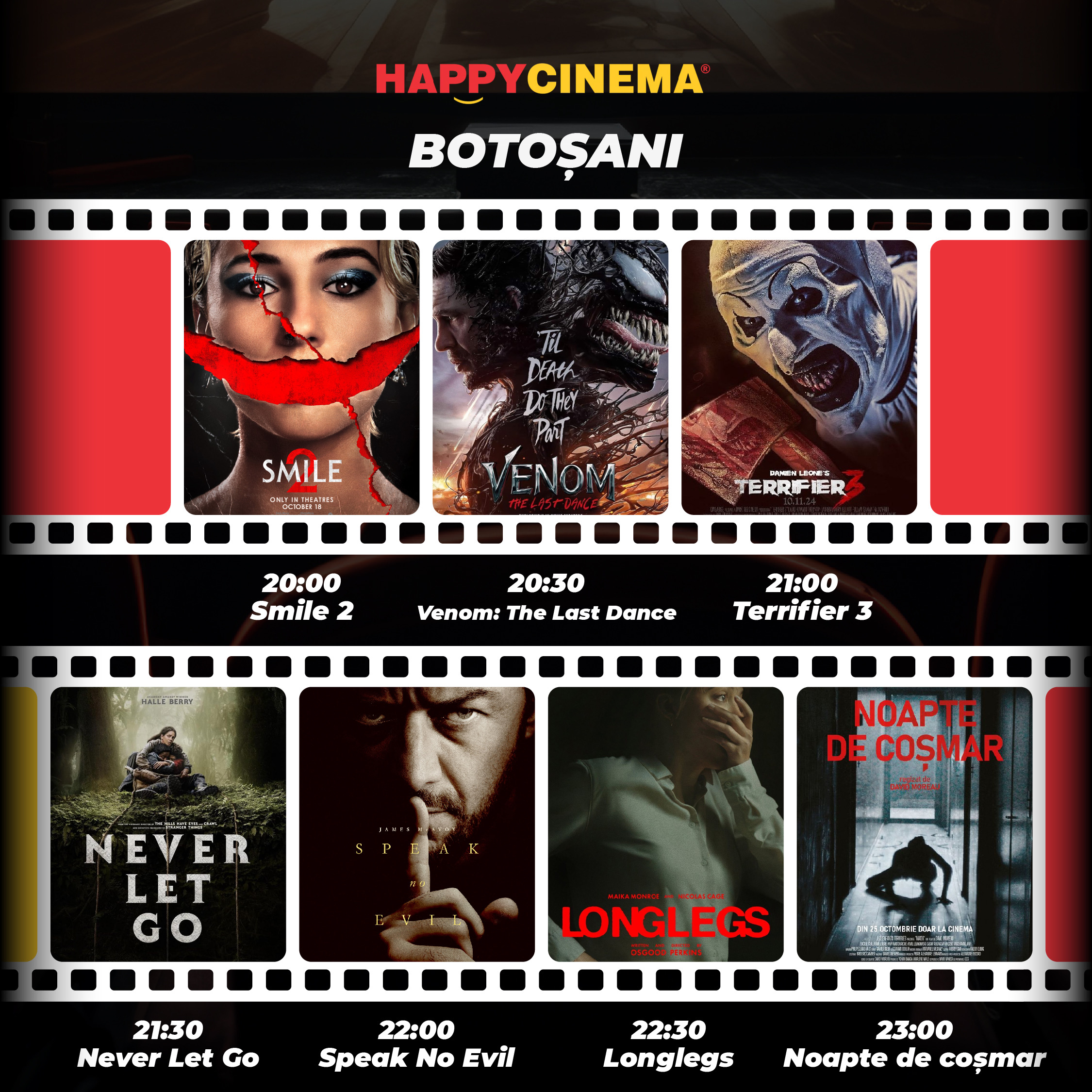 Evenimentul de pe 31 octombrie începe de la ora 20 :00, cu proiecția Smile și se încheie după miezul nopții, cu filmul Noapte de coșmar, fiind destinat tuturor celor dornici să petreacă o noapte specială în compania unor filme de referință, astfel că, fie că veniți singuri, fie că veniți cu prietenii, acest maraton va transforma Halloween-ul într-o experiență de neuitat!