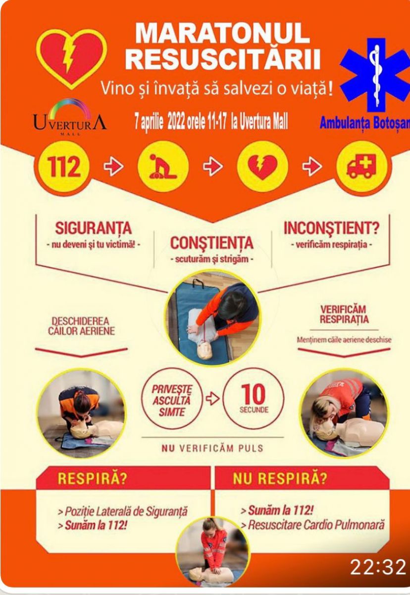 Serviciul de Ambulanță Botoșani, în parteneriat cu Uvertura Mall Botoșani, vă invită de la mic la mare la Maratonul Resuscitării „Vino și învață să salvezi o viață!” - curs interactiv de resuscitare cardio-pulmonară.
