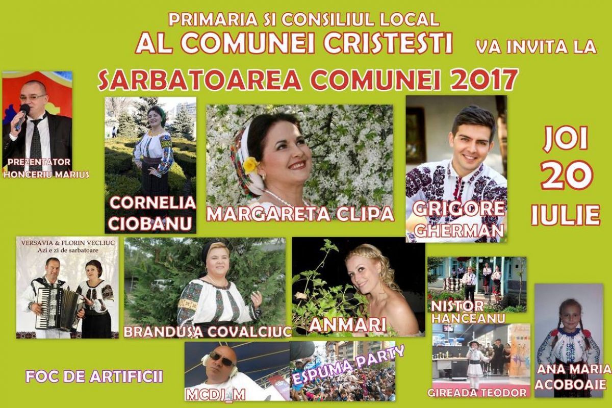 Astfel, după slujba religioasă de la lăcaşul de cult menţionat, pe terenul de sport din Cristeşti va avea loc un spectacol la care îşi vor da concursul, printre alţii, Margareta Clipa, Cornelia Ciobanu, Brânduşa Covalciuc, Grigore Gherman.